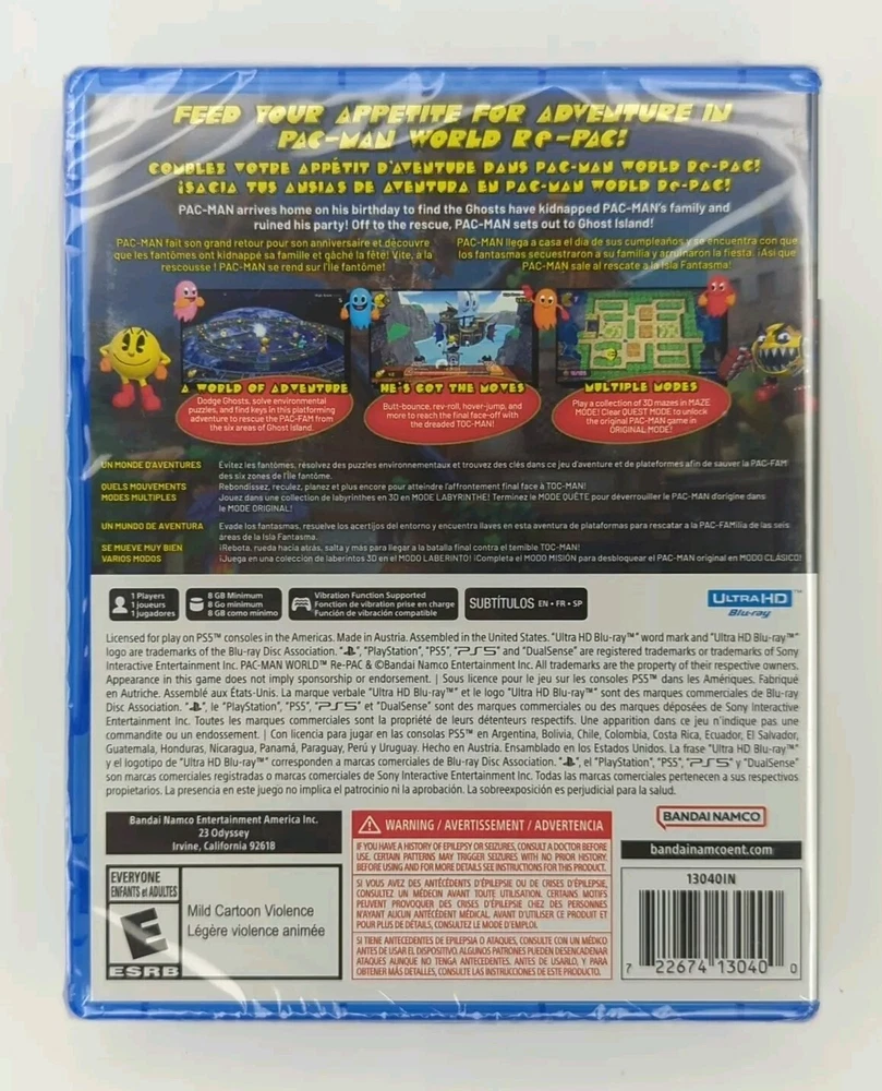 PAC-MAN World Re-Pac for Sony PlayStation 5 is a brand new video game released in 2022. It is a platformer, action & adventure, and arcade game published by NAMCO. The game comes factory sealed with the manual included, offering a complete edition experience. It is rated E for Everyone and is part of the Pac-Man video game series. Small tear in shrink wrap. Shown in photos.