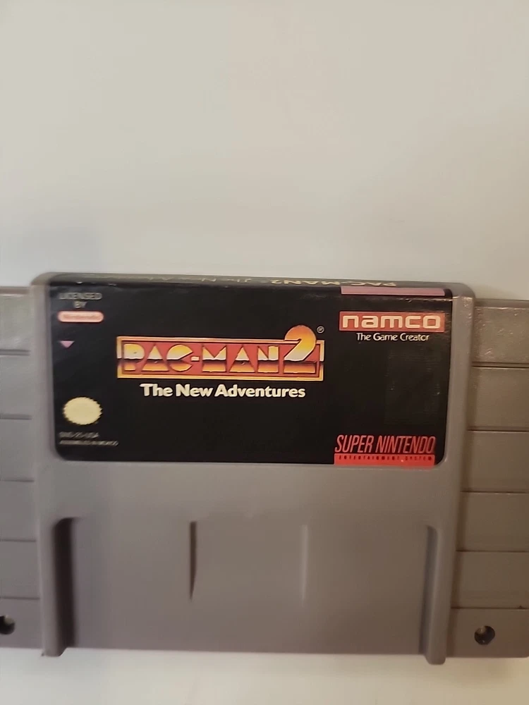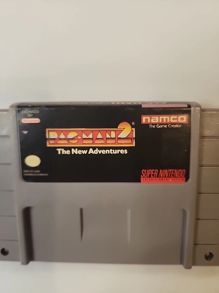 Pac-Man 2 The New Adventures for the Nintendo SNES is a 1994 action-adventure game published by Nintendo. It is part of the Pac Man video game series and is rated E for Everyone. This version is for the NTSC-U/C region and is a cartridge only. The game was developed in Japan and has been tested for playability.