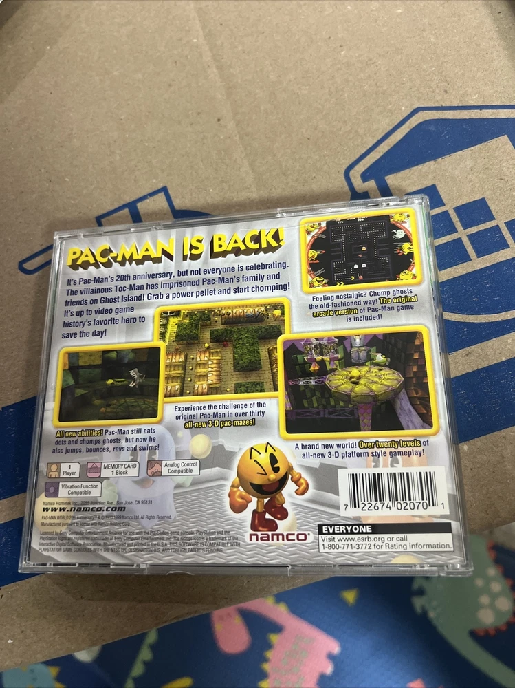 Publisher:Namco BandaiGame Name:PAC-MAN World 20th AnniversaryRelease Year:1999UPC:0722674020701MPN:722674020701gtin13:0722674020701Video Game Series:3d HuntingRating:E-EveryoneGenre:Platformer, Action & AdventurePlatform:Sony PlayStation 1