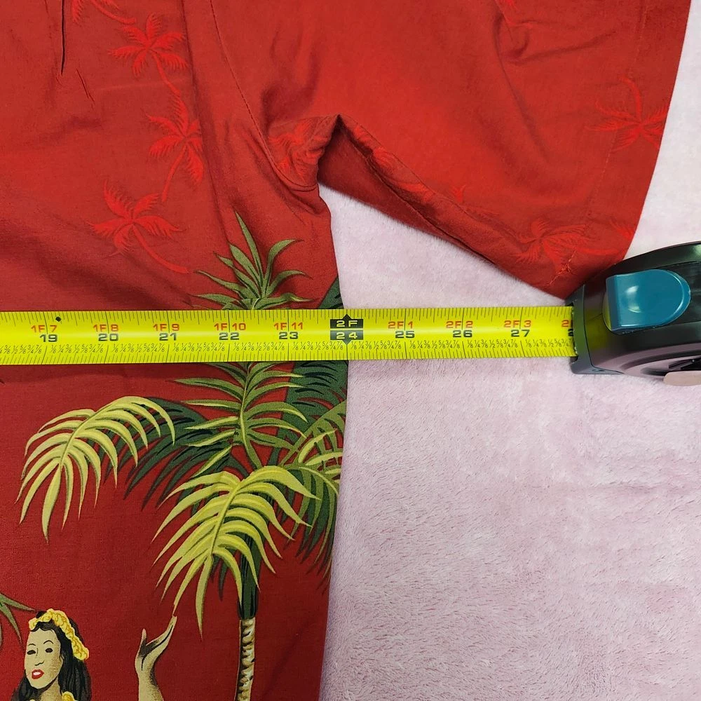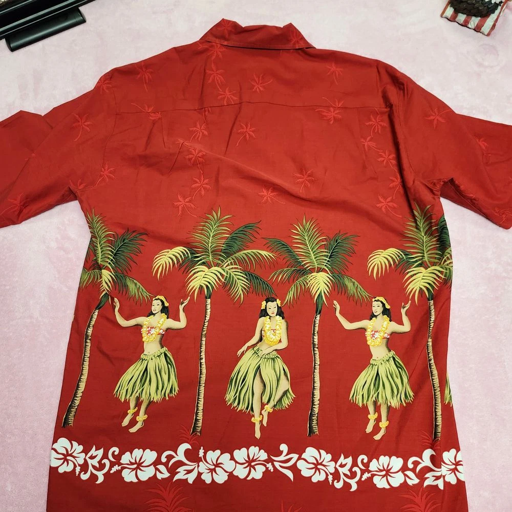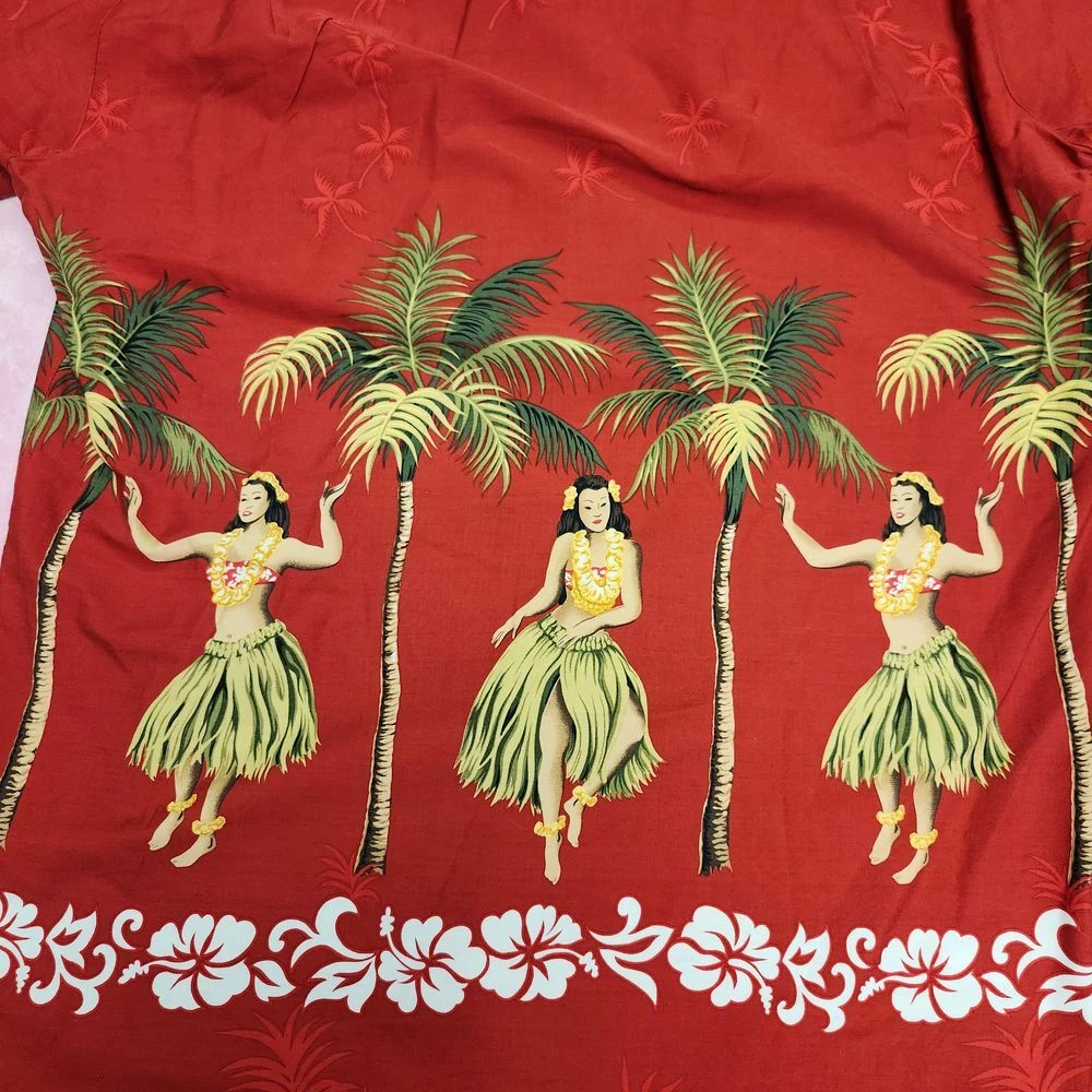 Transport yourself to a tropical paradise with this vibrant Pacific Legend Hawaiian shirt. Featuring a stunning red backdrop adorned with graceful hula dancers, swaying palm trees, and a hibiscus flower border, this shirt embodies the spirit of aloha. Perfect for beach vacations, luaus, or casual Fridays, it's sure to turn heads and spark conversations. Embrace the laid-back island lifestyle and make a bold statement at your next summer gathering or themed party. Sleeve Length: Short Sleeve Color: Red Department: Men Type: Button-Up Pattern: Tropical Fabric Type: Woven Closure: Button Accents: Printed Features: All Seasons, Contrasting Trim Material: Cotton Fit: Regular Character: Hula Dancer, Tropical Figure Collar Style: Spread Neckline: Collared Keywords: Hawaiian shirt, Aloha shirt, Tropical print, Hula dancer, Palm tree, Hibiscus, Beach wear, Vacation attire, Luau, Summer fashion, Pacific Legend, Button-down, Short sleeve, Red shirt, Novelty print