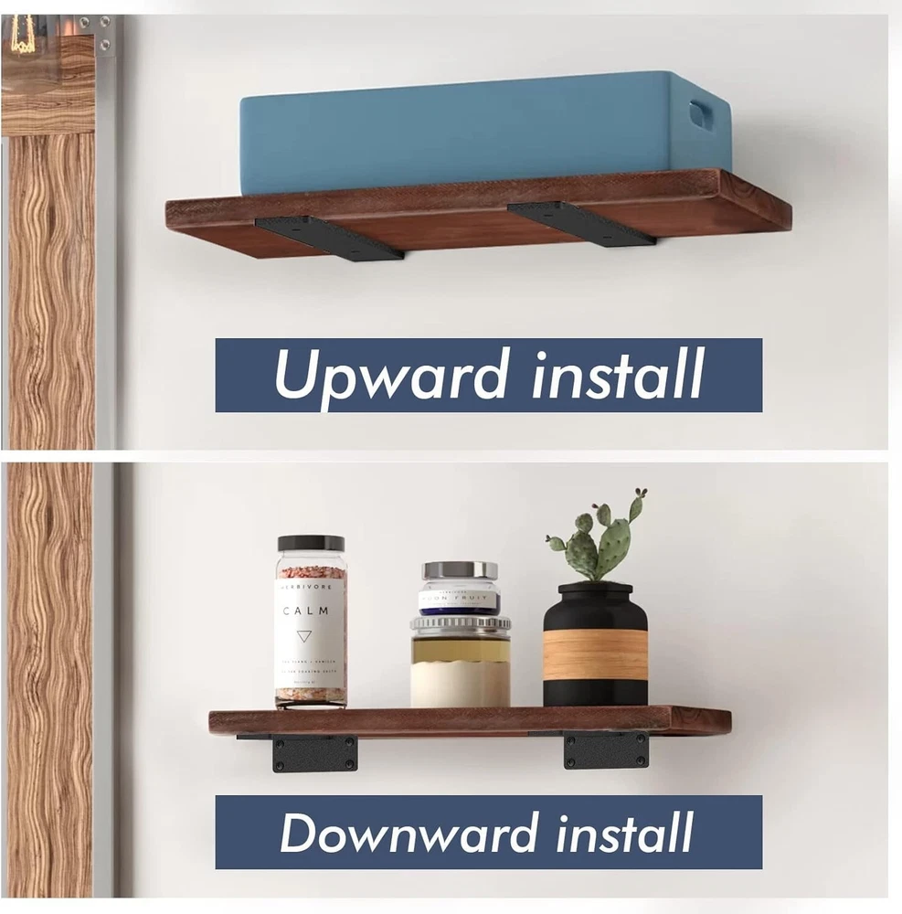Pack Floating Shelf Brackets, Inch Heavy Duty Industrial Shelf Bracket, Black Metal L Brackets for Shelves Support DIY1/5 Inch Thicked Real Hidden Brackests: These black shelf brackets have no lips and can be truly hidden. The base can be blocked by the plank, creating an amazing floating illusion. Compared with other floating shelf brackets, this bracket is easier to install Heavy Duty: This kind of metal bracket is thicker and heavier, each one has a solid weight and density. Weight capacity of 150 lbs per pair. The surface of the frosted particles has a richer texture, has anti-scratch and anti-rust functions, and can be used for life. Hardware Included: The package includes supports, 32 long screws, 16 short screws and 32 anchors. The countersunk screw hole SATISFACTION GUARANTEEs that the nut stays flush with the bracket without being obtrusive. Perfect DIY Project: Improve item storage efficiency. Make the most of your family space. Including but not to kitchen, bathroom, bedroom, office, warehouse. You can even use it as a cat climbing wall support. Two Installation Methods: Our floating shelf brackets can be installed upwards or downwards, and it is certain that no matter which installation method is chosen, it can be easily done.