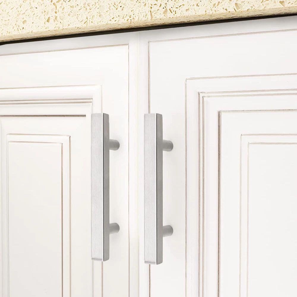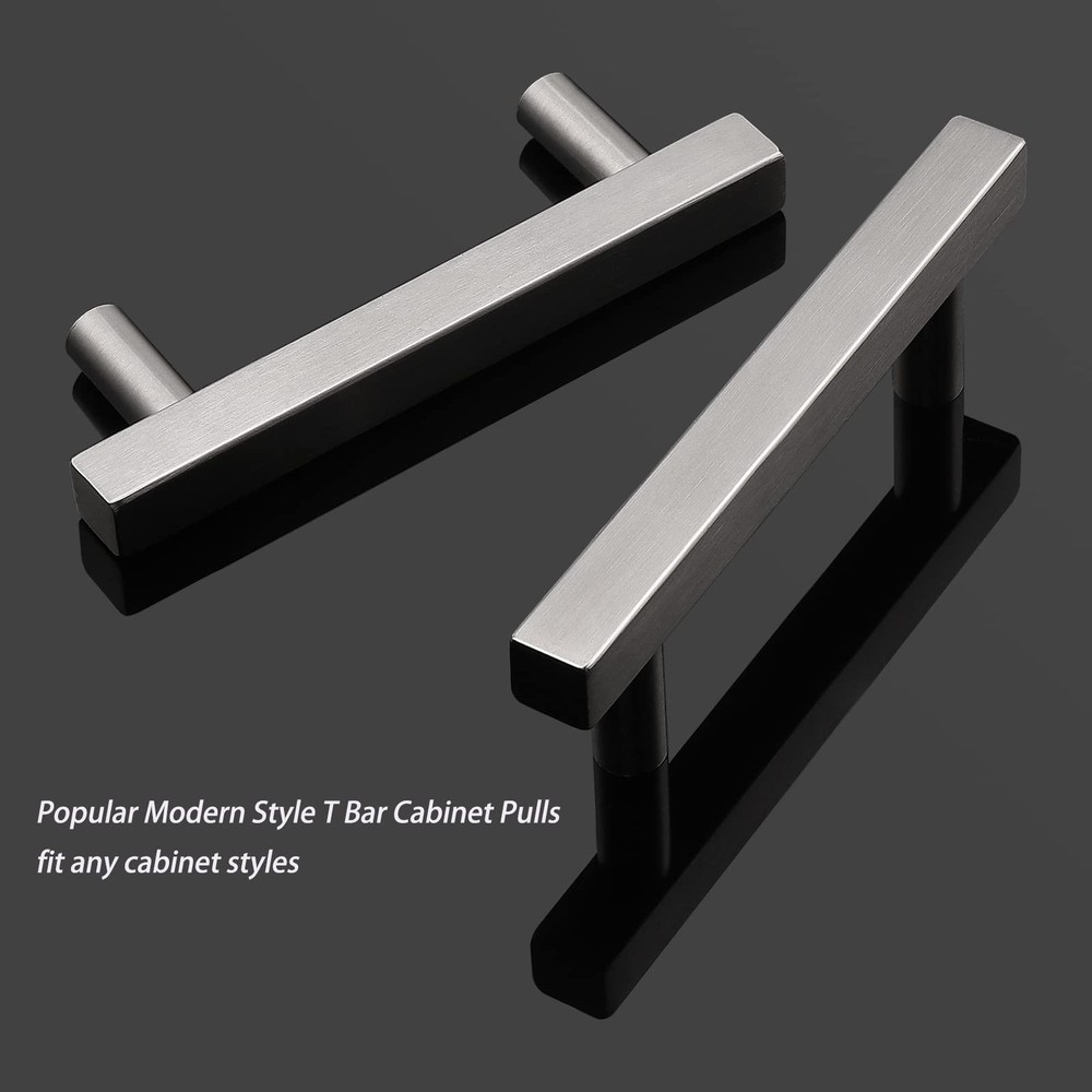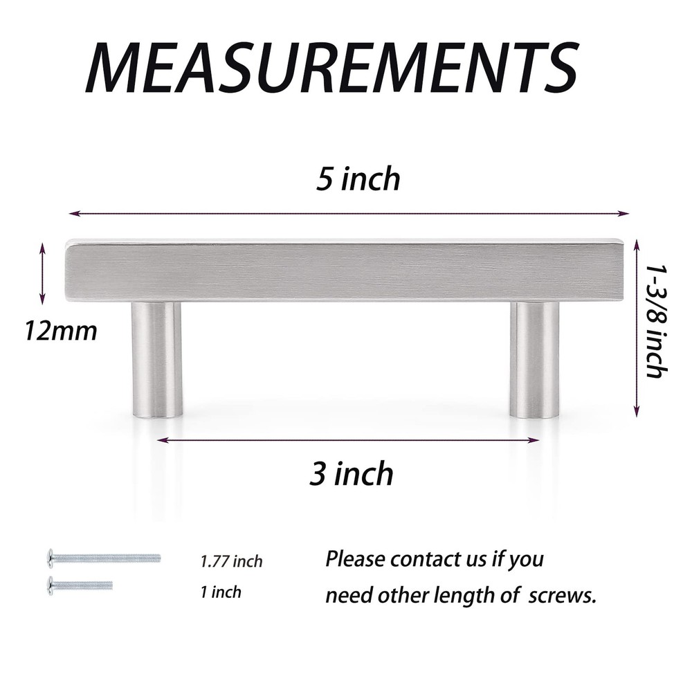 Material:Stainless Steel;Finish:Satin Nickel; Hole Centers:76mm(3inch);Overall Length:127mm(5inch);Width:12mm(1/2");Height:35mm(1.4") Strong & Durable Furniture Hardware: Popular Modern Style T Bar Cabinet Pulls, will fit any cabinet styles.Perfect for kitchen cabinet, furniture door, cupboard, desk drawer, wardrobe drawers, shoe cabinet, chest, bookcase and much more. Easy to Install with Included Screws,2 size screws include:1inch(25mm) 1.8inch(45mm),If your drawer/door is thicker,you can buy longer screws from . Package Includes: Selected Handles, Mounting Screws, Installation Instructions;please check these parts before install,If there is any quality problem with your purchasing, please us. We will the item value or send a .