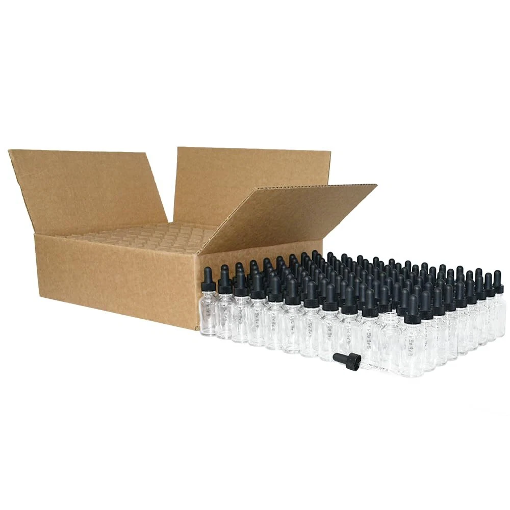 This (Pack of 108) 1 ounce clear Boston round glass bottles with black milliliter graduated glass droppers is the solution to your liquid storage needs. These high-quality clear glass bottles will pristinely display your liquid creations. Dispense your liquids exactly by the milliliter with ease and precision with these graduated black dropper closures. Store and dispense your essential, massage, and beard oils, tinctures, homemade remedies, vape juice, and medicament with ease, or share with family and friends as handmade gifts. These make great kitchen storage for flavorings, oils, spices, extracts, or any liquid ingredients that needs to be dispensed by the milliliter dropper amount. The clear (flint) glass bottle allows you to identify the contents and looks great with any label. (Pack of 108) 1 oz. Clear Boston Round with Black Milliliter Graduated Glass Dropper These high-quality clear glass bottles will pristinely display your liquid creations. Dispense your liquids exactly by the milliliter with ease and precision with these graduated black dropper (20/400) closures. The clear (flint) glass bottle allows you to identify the contents and looks great with any label. Decoratively package handmade gifts of essential, massage, and beard oils, flavorings, extracts, spices, herbal creations, vanilla, and homemade remedies. Proudly packaged in the USA by Americans!