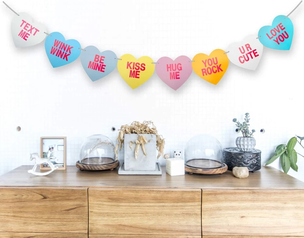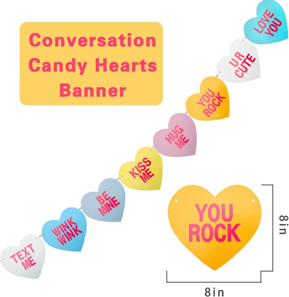 [Pack of 2]Valentines Day 2] Conversation Hearts Banner, Pink, White Product Details Shape: Heart Manufacturer: Gaudiwel Product Dimensions: 8 x 8 x 0.04 inches Item Weight: 4.6 ounces Item model number: CA10-P Brand: Gaudiwel Color: Pink, White Material: Paper Item Length: 6 Feet Number of Light Sources: 1 PERFECT VALENTINE DECORATIONS - each HEARTS sayings Text Me, Wink Wink, Be Mine, Kiss Me, Hug Me, You Rock, U R Cute, and Love You VALUE PACKAGE - Come with 2 strings at fair price. NO DIY - come pre-strung, just open the package and hang these heart banners up. LARGE SIZE - Each heart is about 8x8”, and each string is about 6 feet long. Also you can adjust the distance between each heart to achieve how you want to look like.