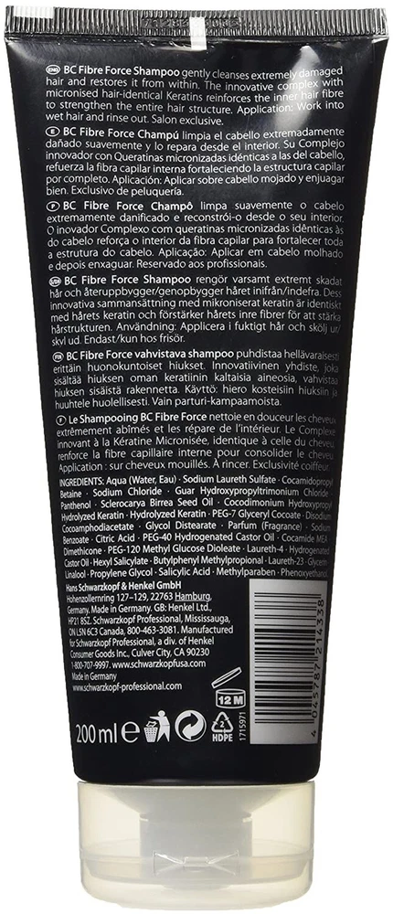 Schwarzkopf BC FibreForce Shampoo 200ml / 6.8oz Each Order has 4 of Schwarzkopf BC FibreForce Shampoo delivery! Schwarzkopf BC Banasura Fiber Force Shampoo 6.8 Oz / 200 ml Benefit: BC Fiber Force Shampoo gently cleanses extremely damaged hair and restores it from within. Application: Work into wet hair and rinse out. For extremely eroded hair A New Generation Of Hair Replenishment For Virgin Hair Quality BC Fiber Force introduces a new dimension of hair repair returning even most eroded hair to its optimal level of force and resilience. For the first time the formulas with Micronized Hair-Identical Keratins penetrate deeply into the hair architecture to re-cement specifically the Cell-Membrane-Complex, the intercellular bonding cement responsible for strong and resilient hair fiber.