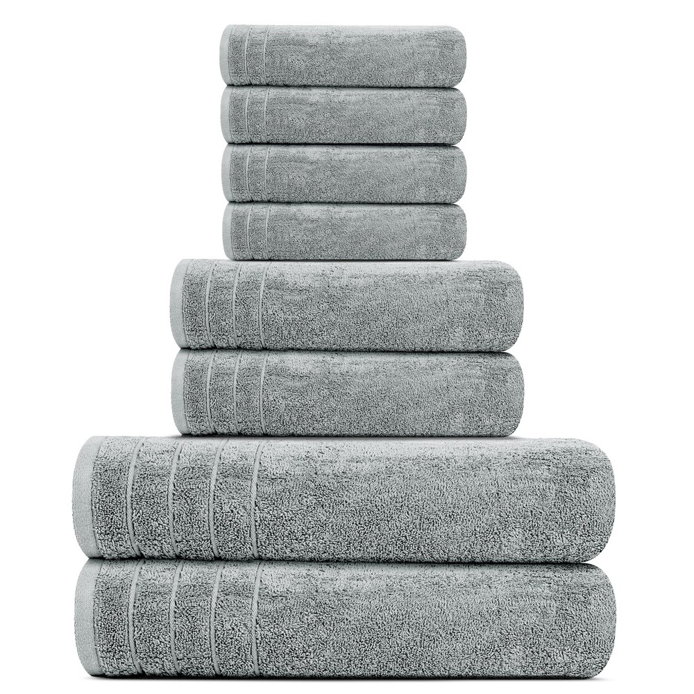 "Super Fine Cotton: This towel set is made from super fine cotton for added softness so that you feel relaxed and refreshed after wrapping yourself in a soft and fluffy bath towel after your shower, just like hotel towels. Extra Soft and Highly Absorbent Luxury Bath Towels: These towels are perfect for your daily routine. They are the ideal weight for extra absorbency features. Use this 8-piece towel set by for lighter weight, extra softness, fluffiness and quick absorbency to fulfill your daily needs. 8 Piece Towel Set for Everyday Use: This is a complete towel set perfect for your household’s daily needs. It includes 2 extra-large bath towels, 2 hand towels and 4 washcloths which is a perfect combination to fulfill your family’s requirements. Feel comfortable in using this towel set every day. Oekotex Certified and Made in Green: To give you and your family the best care, the products at are manufactured with OEKOTEX and Made in Green certifications. Top Quality Standards: We take our quality control seriously. From raw materials to production, finished goods, and even packaging, all materials are all passed through rigorous checks placed at every step in our production facilities. The benchmark criteria for our quality control checklists are high. We take extra care to ensure that our customers are happy and satisfied with our product. Best in Durability: We use high quality materials to improve the durability of our towels and to make them long lasting so that they are ideal for your everyday use. Measurement: Extra Large Bath Towel: 30 x 60 inches Hand Towel: 16 x 28 inches Wash cloth: 13 x 13 inches" Light Weight and not too thick: The reduced thickness makes it more convenient to carry, allows for quick drying & is energy efficient This package contains 2 extra large bath towels 30 x 60 in, 2 hand towels 16 x 28 in and 4 washcloths 13 x 13 in Designed in Super Fine Cotton to provide a softer texture and feel Wash before first use. Wash them on their own, use mild detergent and avoid bleach & fabric softeners. Refrain from ironing Use tumble dry on low heat. Over-drying towels can increase linting and reduce lifespan of towels. Shedding is natural on initial wash/dry cycles
