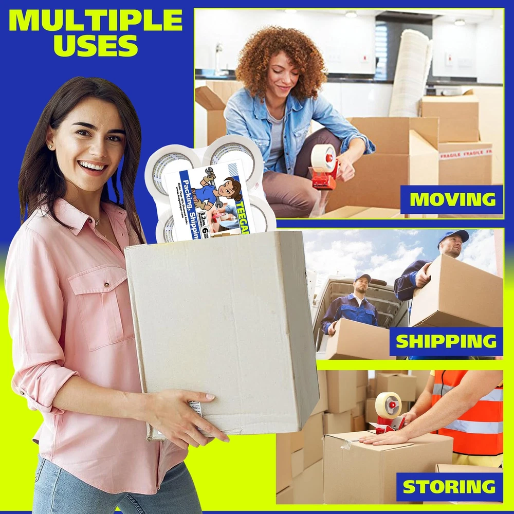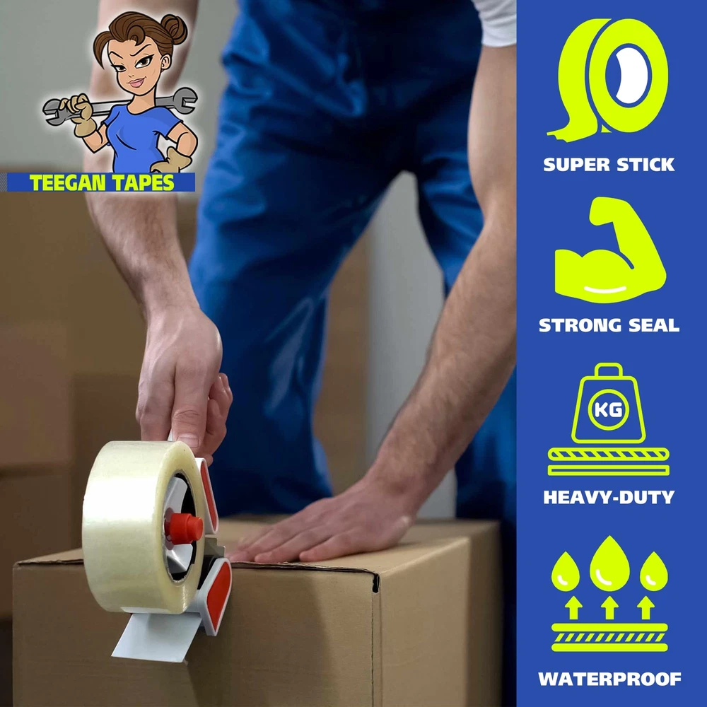 TEEGAN TAPE: PROVIDING THE BEST PACKING TAPE Teegan Packing tape: *Is tough, powerful and secures boxes tightly *Perfect for indoor/outdoor use *VERY strong Adhesive. Apply once and never worry Ideal for moving, packing, sealing, storing boxes of all shapes, sizes and weight. Tape Specs: *Adhesive: Water Based Acrylic *Service Temperature: -10F to 140F *Tensile Strength: 36.48 lbs/in *Film Thickness: 48mic Adhesive sticks to double and even triple wall corrugated *Can also be used for bookbinding, repair tape, wrapping, bundling, protecting wires, sealing tape, *Unlimited Value: Our customers stay with us for life. *We stand behind the quality of our gaffer tape and if you're not 100% satisfied with your purchase, we have a no hassle money back . DURABLE SEALING & SECURING; Designed to withstand the rigors of shipping, our clear tape offers unwavering adhesion to keep packages securely sealed, ensuring contents remain intact during transit. Its ease of use, along with a strong and durable construction, makes it a go-to choice for businesses and individuals alike. HANDLES ALL YOUR , PACKAGING & SHIPPING NEEDS: Professional clear package tape made for all of your mailing, packing & shipping needs across the country and all over the world. This boxing tape for moving will hold tight and safely deliver any package from Tibet to Texas and everywhere in between. SAVE MONEY WHILE GETTING THE JOB DONE; With our affordable and economical heavy duty shipping tape option, you'll receive 6 full rolls of 60 yards clear packing tape 2 inch wide each providing more value than other packing tape options on the market. With more than 60 yards per roll, you won't have to constantly replace the roll during your task. Our package tape for shipping rolls are larger and thinner than other options, reducing the cost of shipping. MAXIMUM ADHESIVE QUALITY: Our clear heavy duty tape by Teegan Tapes is the optimum packing tape for ultimate adhesion to most surfaces including wood, hardwood, metal & stainless steel, concrete, tile and vinyl laminate flooring. Our ultra thick (3.2 mil) clear packing tape is resilient and tough enough to use indoors and outdoors in all seasons. 100% SATISFACTION : We can't wait to add you to our long list of customers enjoying the superior quality of Teegan heavy duty tape for packing. We back up all our tape, and proud to do so. You can buy with total confidence. Us Anytime, Our Florida based Team Is Always Around to Help.