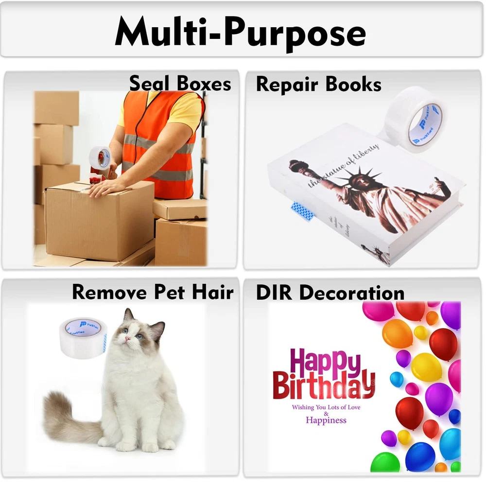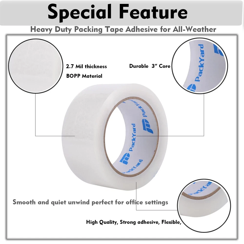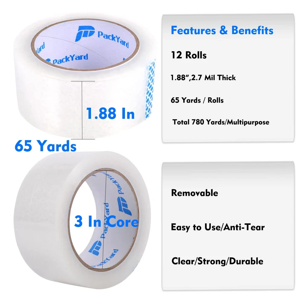 12 Heavy Duty Strong Rolls:This packing Tape Provides excellent holding power strong and anti-splitting for normal, economy or heavy-duty packaging and shipping supplies,Fit for standard width 1.88",3" core dispenser gun, each roll 65 yards long total more than 780 yards( 2340 feet),convenient length High Quality Heavy Duty Tape- 2.7 mil thick thick tape is very good in thickness and toughness, will not tear or split easily. Perfect long lasting bonding range in performance for shipping and storage in hot/cold temperatures. Strong Excellent Adhesive: With strong & secure BOPP acrylic adhesive, the sturdy tape sticks very well and holds boxes together. The extra strength of the material prevents clear packing tape damage during shipping. Perfect long lasting bonding range in performance for shipping and storage. Easy to Use: This transparent tape is suitable for all standard tape dispensers and tape guns. You also tear with your hand. Provides excellent holding power for normal, economy or heavy-duty packaging and shipping supplies. Wide Applications - Apply at the depot, home and office use. The tape could be used for shipping, packaging, box and carton sealing, removing clothing dust and pet hair.