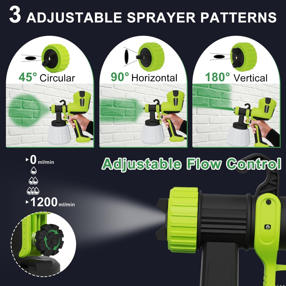 If you have any questions, please feel free to contact the team and we will help you solve your difficulties within 24 hours.Please be sure to confirm the voltage before use! 700W paint sprayer includes 1.0–3.0 mm nozzles for various painting projects. Flexibly switch between horizontal, vertical or circular spraying to suitable spray a wide range of scenes such as walls, doors, chairs, etc. You can use the dust blowing joint with the paint sprayer to blow away the dust or debris on the surface, get clean surface. The 700W HVLP paint sprayer Upgraded 100 Din-s max viscosity Comes with a large 1200 ml container. Adjustment knob lets you control the paint flow and spray areas that the spray roller can't reach, giving you a smooth effect. The paint sprayer can be easily assembled. With a cleaning brush and a needle to unclog any hardened paint remaining in the nozzle, clean it easily and efficiently. If you have any questions, please contact us via your order, and you will get a reply within 18 hours. Our technical team and after-sales team are always here to assist you.