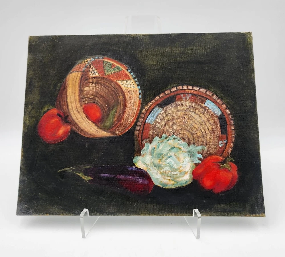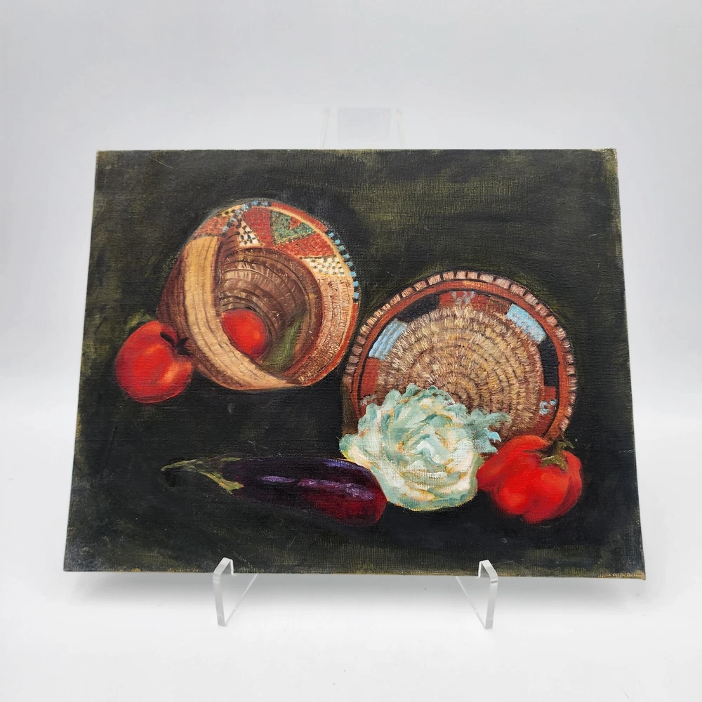 This still life painting of Native American Indian baskets is on a 14"x11" canvas hard board. The unsigned picture is an original work of art depicting two hand crafted Indian baskets and vegetables (eggplant, tomato, red pepper, and cabbage). Interestingly, these plants would not have historically been known to the southwest tribes. Regardless, this is still a good example of American folk art.