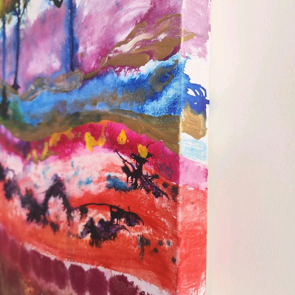 This contemporary watercolor painting is quite large, measuring 40"x30"x2." The painting is stretched around the sides and therefore does not need to be framed. This painting is unsigned, and the artist is unknown. The imagery is that of a landscape filled with trees in a rainbow of bright colors. Wavey lines represent changes in elevation both in the foreground and behind the trees. Touches of gold have been strategically placed throughout the picture to add highlights. This modern piece can cover a large wall and offer a burst of color; perfect for breaking up the monotony of an otherwise bare wall.