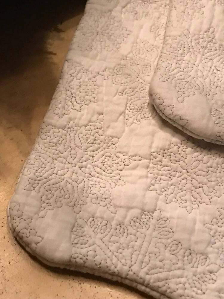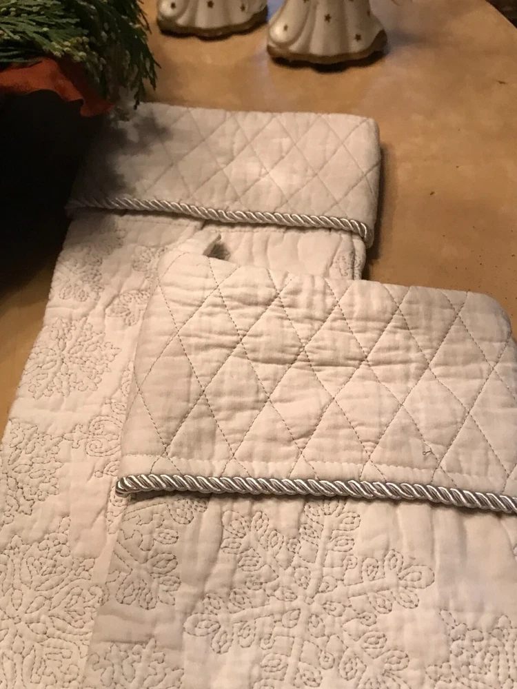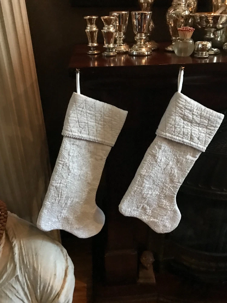 Pair of Beautiful White Quilted Christmas Stockings Measures 18" long by 10" at bottom and 7 1/2" at top. These are white cotton, and beautifully quilted with a light blue thread in an intricate and lovely pattern. They have a silver and white cord, and loops to hang (see photo). These are like new! ***CLEARANCE SALE!!!