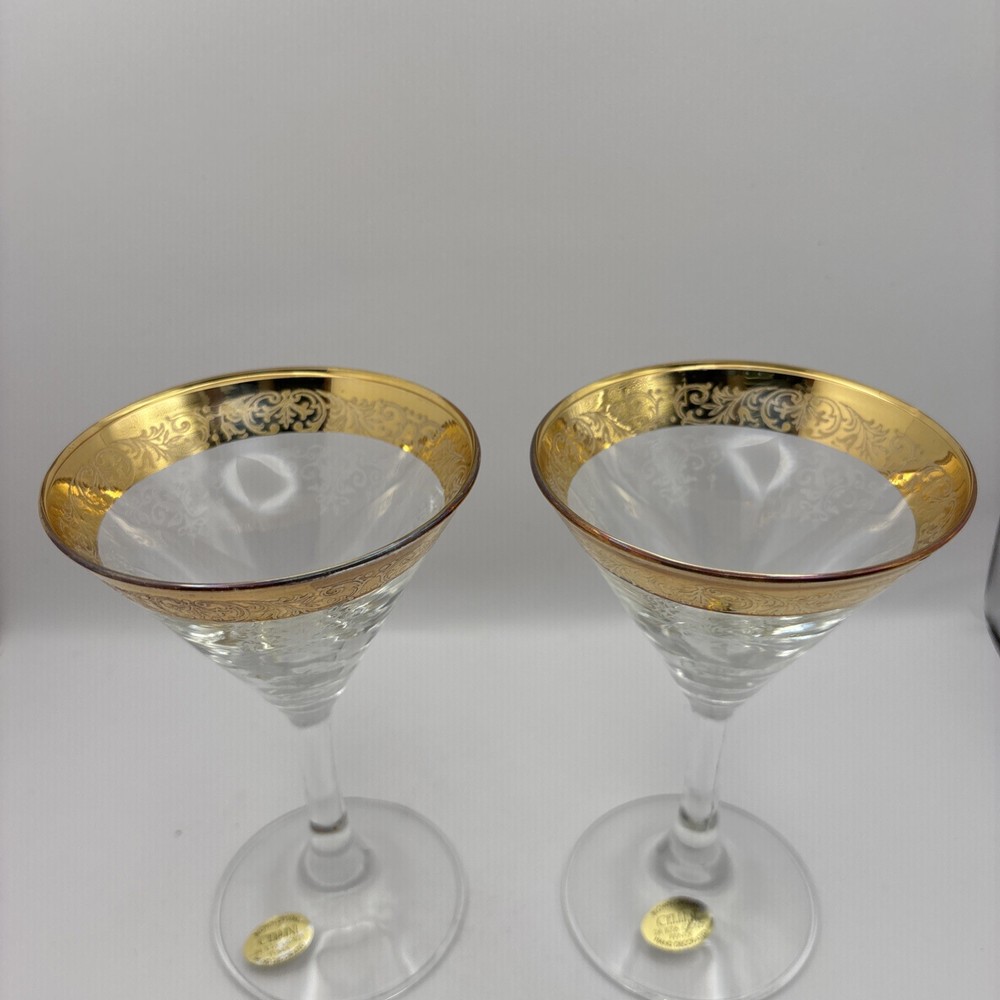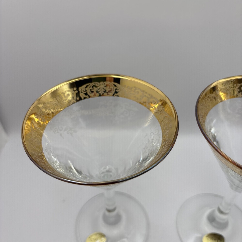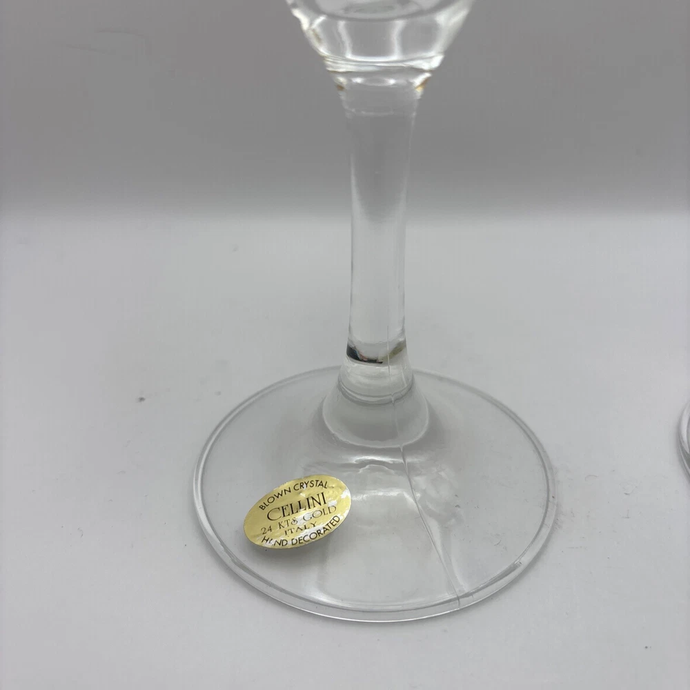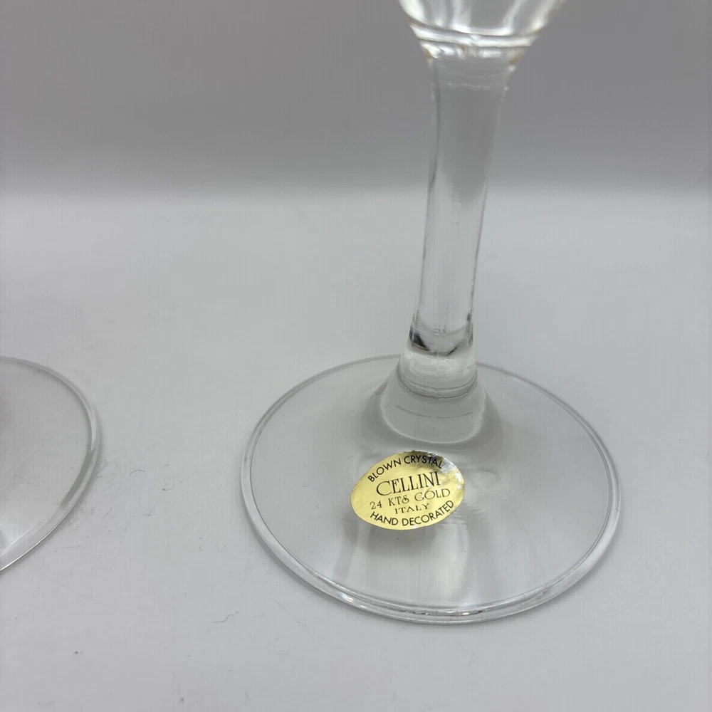 This is a pair of Cellini Crystal champagne glasses decorated with 24 karat gold. Please note there is some gold loss. Made In Italy