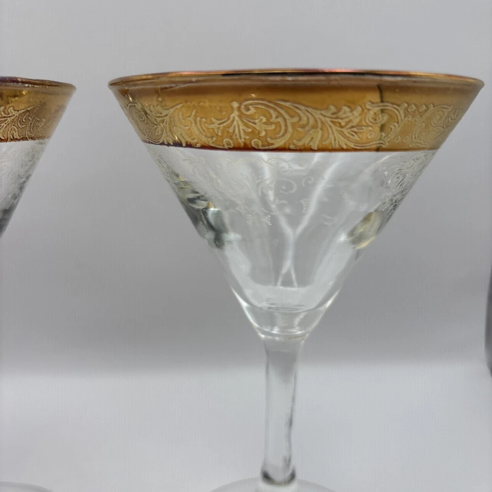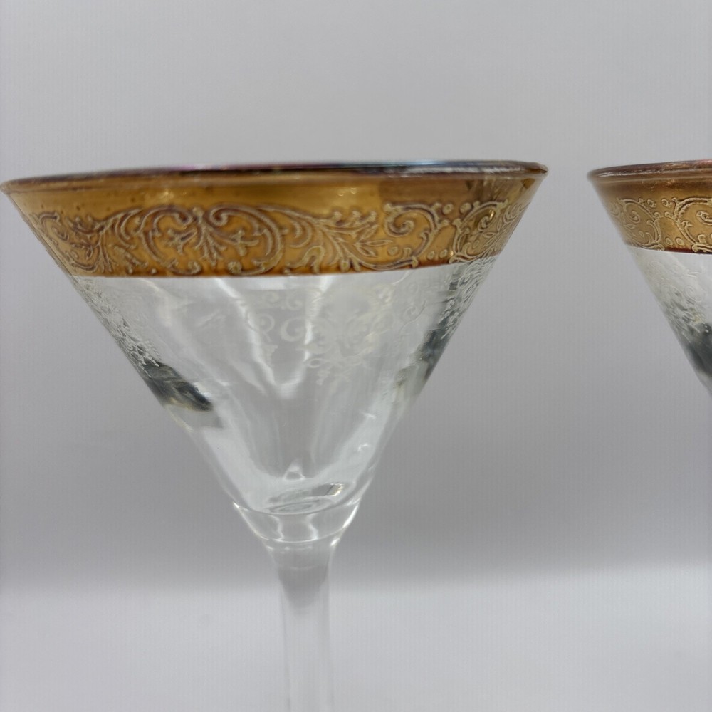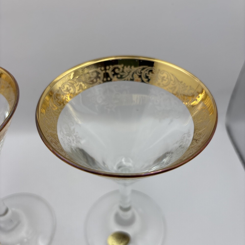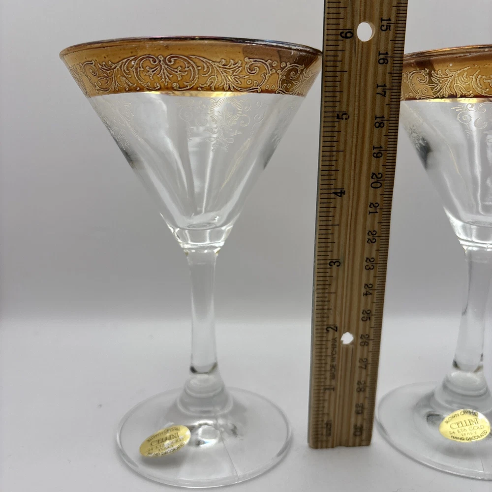 This is a pair of Cellini Crystal champagne glasses decorated with 24 karat gold. Please note there is some gold loss. Made In Italy