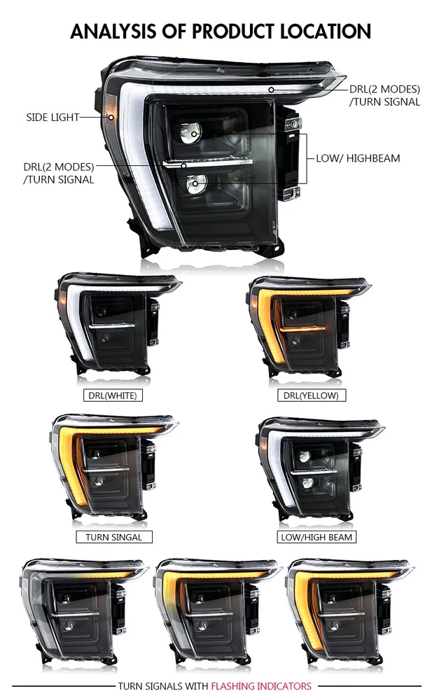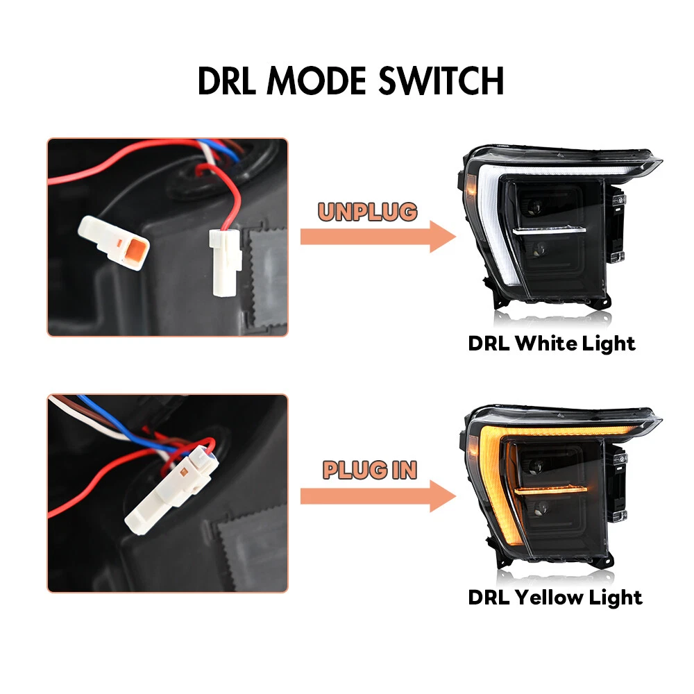 Pair Front Lamps For 2021 2022 2023 Ford F150 LED Projector Headlights Head Lamp Features: 1. One pair: Left + Right head lights 2. Bulbs: All bulbs are built-in LED, no extra bulbs needed 3. Function: DRL(White)+Turn Signal(Yellow)+High Beam(White)+Low Beam(White) lights 4. Easy installation: plug and play,same as original one to install 5.Assembly: all parts are included in the package,no need to buy extra bulbs or harness Fitment Fits For 2021 2022 2023 Ford F150 ( Professional Installation is Highly Recommended ) Package include 1 Pair of Headlights (driver's side + passenger's side) Note 1. Please confirm whether this car-lamps can fit your car before buying, if you are not sure, please contact us and send us pictures of your original car light or plug. 2. Using your factory supplied connector/harness will avoid cutting or modifying any wires. Specification ·100% Brand New ·Professional Installation is Highly Recommended ·Welcome to send us message for more information Warranty: One-Year warranty after receiving After Sales Service Please contact us before returning the products, we will do our best to help you solve all the problem well with good service!!! Questions Any question will be replied within 24 hours except the weekend and holiday. We will serve for you all sincerity!