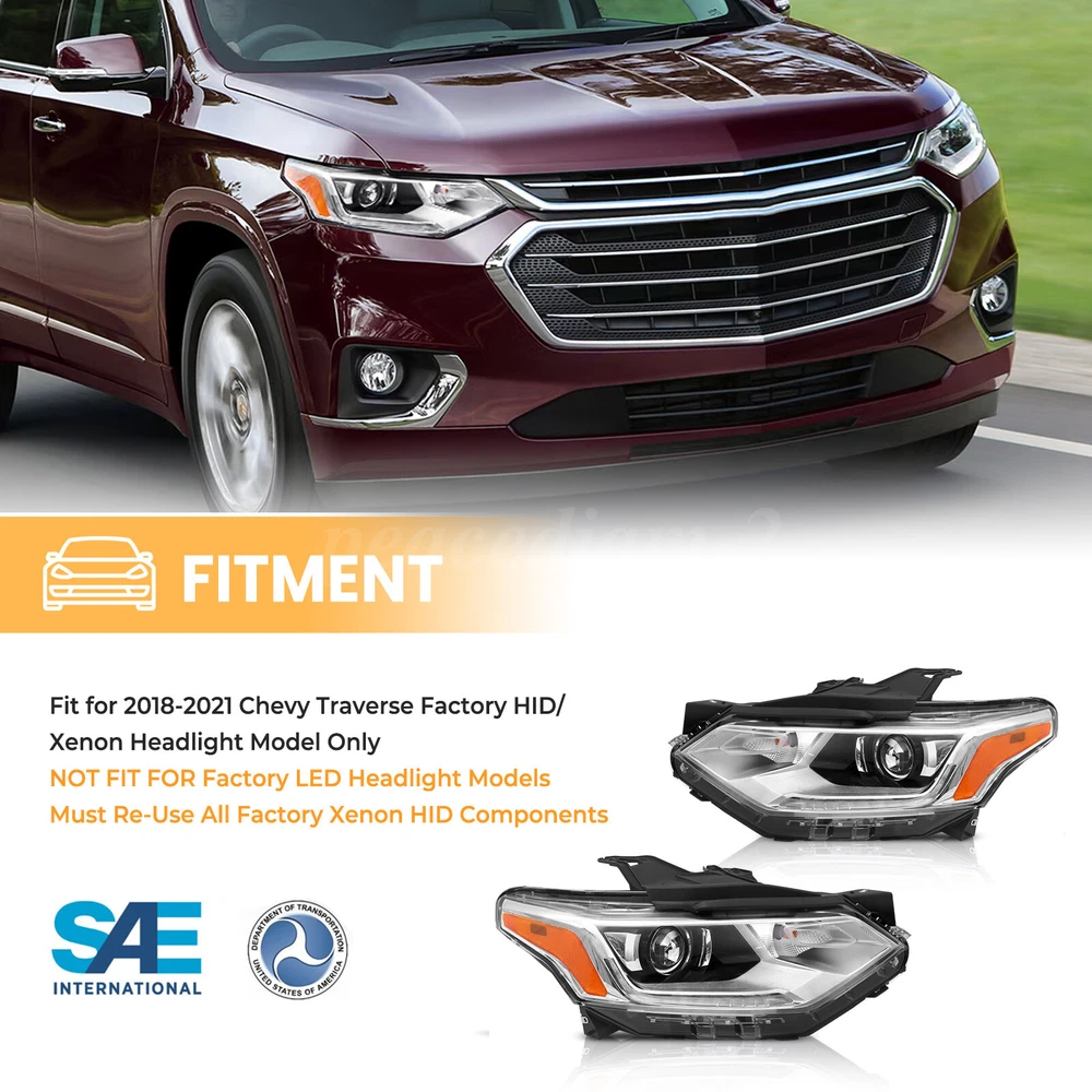 Pair HID/Xenon Headlights Fit 2018-2020 Chevy Traverse With LED DRL Projector PRODUCT DETAILS Description: This 100% brand-new automotive headlight is designed to redefine your vehicle’s appearance, combining sleek lines with refined details for a standout look. Constructed from heavy-duty polycarbonate, it offers durability and impact resistance, ensuring long-lasting clear illumination for enhanced safety. With a plug-and-play design, installation is a breeze, requiring no complex setup. Equipped with premium components and rigorously tested, it delivers exceptional performance and reliability, improving visibility, UV resistance, and impact protection to ensure all-around driving safety. Make every journey a blend of style and security. Specification: Type: Headlight Assembly High/Low Beam: Use stock HID D3S Bulbs DRL: With LED DRL Projector Bulbs Turn Signal: WY21W Side Marker: W5W Housing Color: Chrome Lens Color: Clear Material: Heavy-duty Polycarbonate Condition: 100% Brand New Fitment Type: Direct Replacement Placement on Vehicle: Front, Right Passenger Side, Left Driver Side OE Number: GM2502487 GM2503487 Interchange Part Number: 84887857 84887858 Fitment: Fit for 2018-2021 Traverse w/ Factory HID/Xenon Headlight Model Not Fit for Factory LED Headlight Models Must Re-Use All Factory Xenon HID Components Package Contents: Pair Headlights (Left Driver Side & Right Passenger Side) Without bulbs and wiring harness Features: 【100% Brand New, Redefine Your Vehicle’s Look】Say goodbye to the old and welcome the new. This headlight features a unique design that completely transforms the traditional appearance of automotive lighting, giving your vehicle a fresh, modern look. With its sleek styling and attention to detail, it enhances both the aesthetic and personality of your car, making it the center of attention on any occasion. 【Heavy-Duty Polycarbonate, Quality Choice】Quality is at the core of this headlight. Made from heavy-duty polycarbonate, known for its durability, impact resistance, and lightweight properties, this headlight ensures stable performance even in harsh environments and guarantees a long lifespan. It also provides clearer, brighter illumination, making your drive safer and more worry-free. 【Plug-and-Play, Easy Upgrade】Convenience is a key feature of this headlight. Its plug-and-play design allows for quick installation without the need for complicated steps or specialized tools. No modifications or drilling required, making it easy to upgrade your vehicle’s lighting and give it a fresh new look. 【Exceptional Performance, Safety First】This headlight is equipped with premium internal components and undergoes strict quality control and performance testing to ensure reliable performance under any conditions. Enhanced visibility, superior UV protection, and high impact resistance work together to create a comprehensive safety system that keeps you protected on the road. Note: 1.Please verify compatibility with your vehicle before purchasing. 2.Ensure proper installation before driving to guarantee safety. 3.Due to monitor and lighting differences, the product image may differ slightly from the actual item. 4.Installation instructions are not included; professional installation is highly recommended. PAYMENT We only support transactions on the ebay, do not support offline or private transactions. Please make sure the address is accurate before you pay. SHIPPING We do not ship to PO Box, Alaska/Hawaii, APO/FPO, and US Protectorates. Item(s) would be shipped out within 1~2 working days after received your confirmed payment. Weekends and holidays are not working days. We will choose different warehouses according to the customer's address and item stock, shipped from CA and PA in the United States. RETURN Buyers may return or exchange an item which damaged within 30 days. eBay & PayPal money back guaranteed. CUSTOMER SERVICE We are committed to provide the best purchase experience for our customers. If you have any questions, just feel free to contact us, we respond queries within 24 hours in business days.