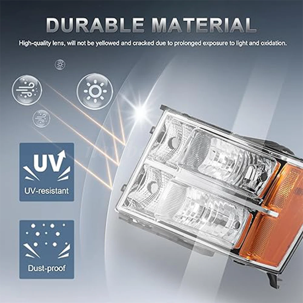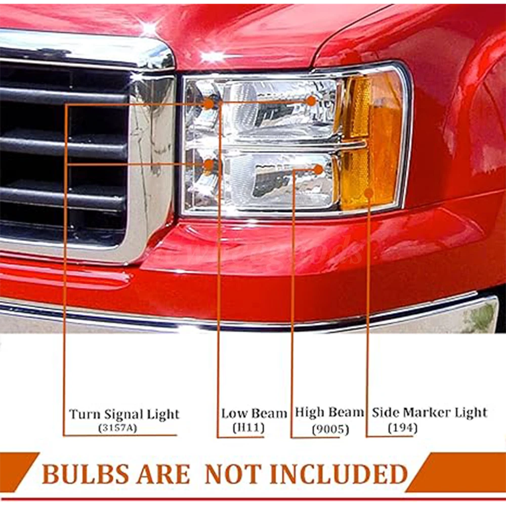 Fitment 1: Fit for 2007-2013 GMC Sierra 1500 OE/OEM Part Number: GM2503283, GM2502283 Placement on Vehicle: Front, Left, Right Fitment 3: Fit for 2007-2014 GMC Sierra 1500 HD 2500 HD 3500 HD Model: For GMC Sierra 1500 2500, 1500 HD / 2500 HD / 3500 HD Lighting Technology: Halogen Features: DOT-Certified, OE-Certified, Sealed Assembly, Waterproof IP67 Low Beam: Use Stock H11 Bulbs For Installation Fitment 5: Fit for 2009-2013 GMC Sierra 1500 Hybrid Number of Bulbs: Bulbs are Not included gtin13: Does not apply Lens Color: Clear & Amber Manufacturer Warranty: Lifetime Fitment 4: Fit for 2007-2014 GMC Sierra 1500 HD 2500 HD 3500 HD Denali UPC: Does not apply Brand: Unbranded Product: For GMC Sierra Headlights Clear Lens Amber Corner Housing Color: Chrome High Beam: Use Stock 9005 Bulbs For Installation Type: Headlight Assembly Fitment Type: Direct Replacement Fitment 2: Fit for 2007-2013 GMC Sierra 1500 Denali Bulb Shape Code: Fit for High Beam 9005 / Low Beam H11 Turn Signal Light: Use Stock 3157A Bulbs For Installation Manufacturer Part Number: For GMC Sierra 1500 2500HD 3500HD, Sterling Chrome, For GMC Sierra Chrome Headlamps Interchange Part Number: 22853029, 25799193, 22853030, 25799194