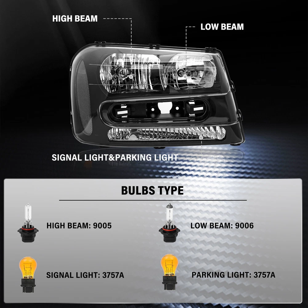 Store Categories Store Categories Other Product Description Compatible with: For 02-09 Chevrolet Trailblazer 02-06 Chevrolet Trailblazer EXT Only Fits Models with Full Length Grill Bar Package Includes: 1 set headlights (high/low beam bulbs are included) Payment Policy Shipping Policy Returns Policy About us Payment Policy We accept PayPal and all forms of credit card. Please submit your payment within 7days after your purchase. Otherwise, eBay will automatically open an Unpaid Item Dispute on our behalf if the item(s) are not paid within 7days. We DO NOT SHIP TO PO BOXES, And Customer Needs To Provide a Physical Address. Shipping Policy All Orders Will Ship Within Two Business Days.Except PR,HI,AK,GU and PO Box addresses. No local pick up All Packages Will Be Inspect Before Shipping, We Will Provide All Packing Material Needed For Your Package For Shipping Such As Boxes, Cushioning And Tape To Improve Shipping Quality. Very Important: Double check shipping address. We are not responsible for incorrect or undeliverable addresses. Returns Policy 30 Days returns satisfaction guarantee.90 Days warranty. All of Our Items Are 100% Brand New, We Do Not Sell Anything Other Than That. If The Item Shows Up Defective or Broken, Please Contact Us Within 3 Business Days By Using "Ask A Question" Link Located At The Bottom of Our Listing. Your Questions/Concerns Will Be Responded Within 24 Hours Monday To Friday. Buyers May Contact us On The Weekends or Pubic Holidays And We Will Respond On The Next Working Day. We Will Offer Replacements, Exchange or Full Refund. 100% Satisfaction Guaranteed. We Will File Damage Or Lost Claim For Our Buyers And Guaranteed Buyers Will Receive Products In A Timely Manner. About us Welcome to AU's eBay Store. We specialize in aftermarket automotive car parts and is the #1 industry distributor for affordable and quality products. We have our warehouse in CA.Item will be shipped out within 48 hours after payment cleared via UPS or Fedex. All emails will be answered within 1 business day during our business hours, except on weekends and major holidays. Before leaving us negative review, please contact our C ustomer Support Team first. We will do our best to offer satisfactory service to the customers. Copyright © 2023 Dianxiaomi
