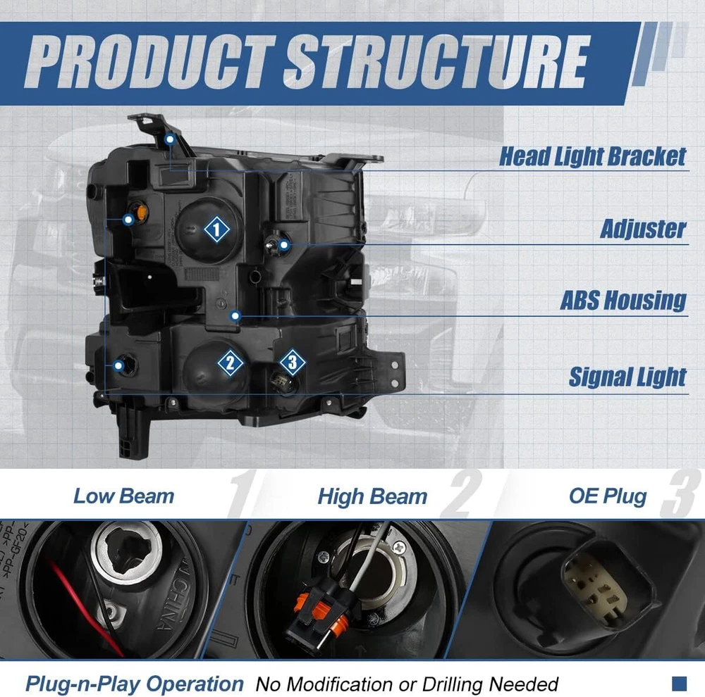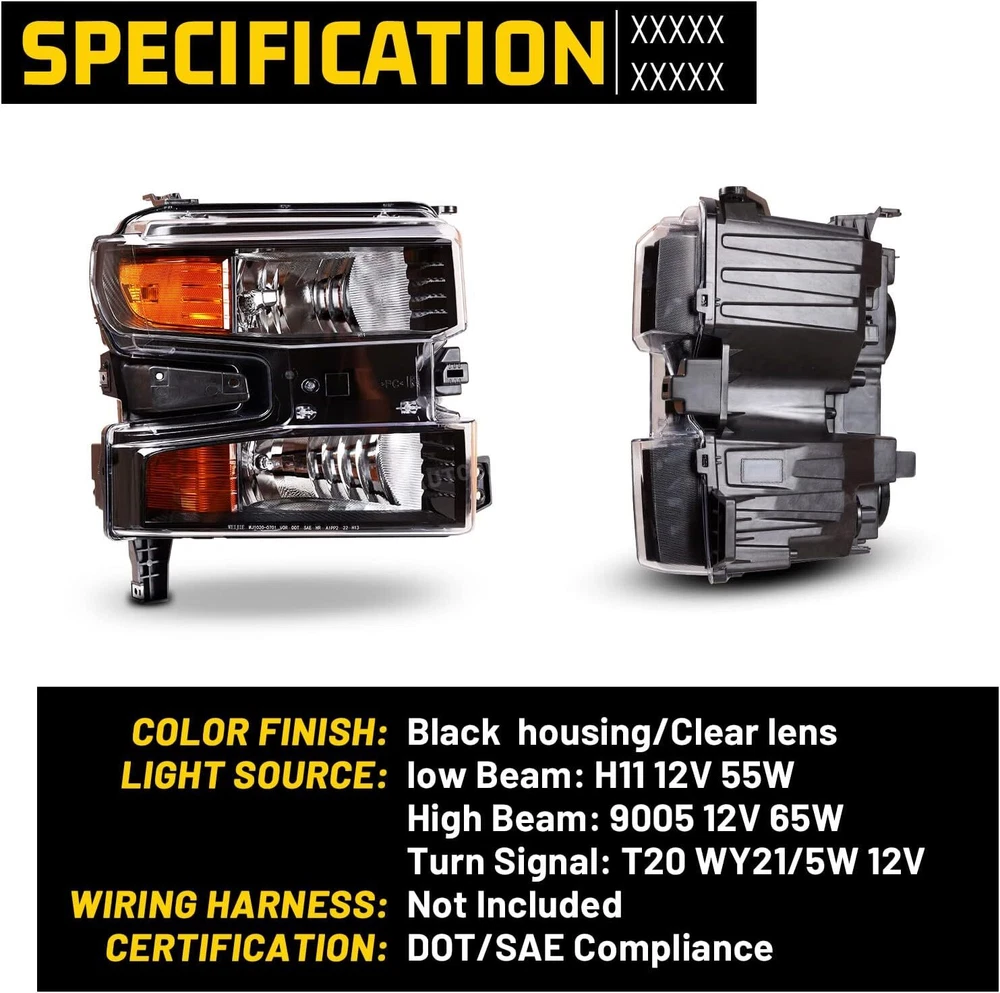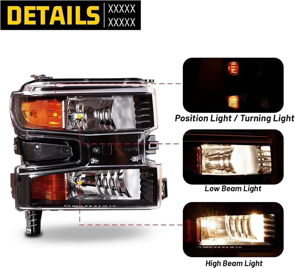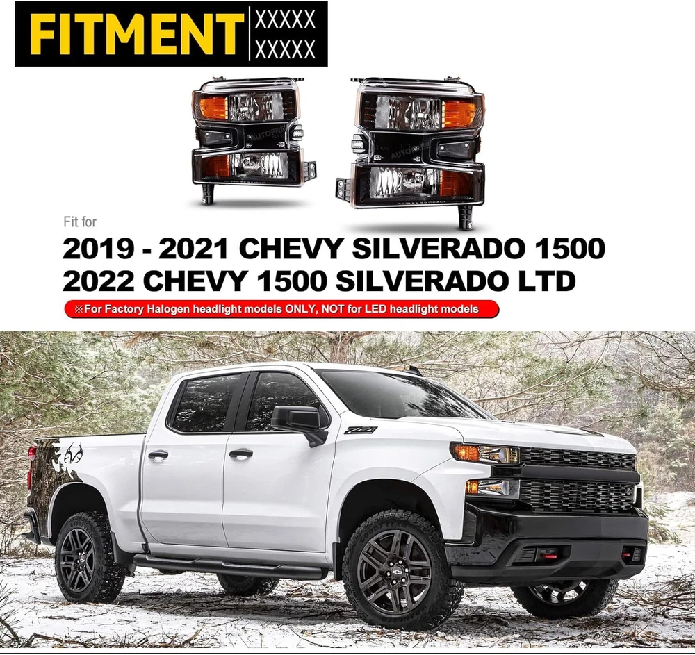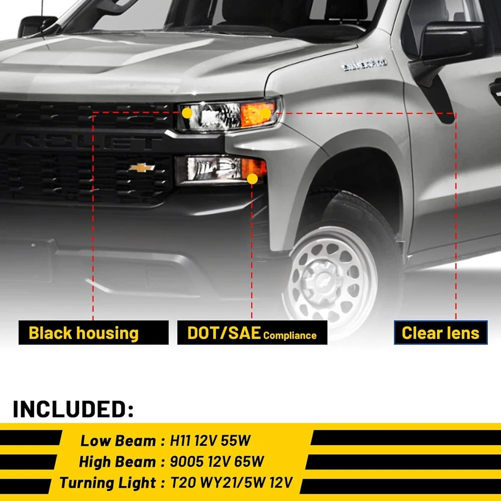 Head Lights Tail Lights Fog Lights Turn Signal Bumper Fender Flare Inner Fender Hubcaps Refrigerator Other Items for sale Head Lights Tail Lights Fog Lights Turn Signal Bumper Fender Flare Inner Fender Liners Portable Refrigerator Specification Low Beam: H11 12V 55W High Beam: HB3(9005) Turn Signal Lights: 7443 Material: PMMA (OEM Grade) Placement on Vehicle: Front, Left, Right Color Finish: Black Housing / Clear Lens / Amber Reflector Wiring Harness: Not included (Plug & Play) Fitment Type: Direct Replacement Certification: DOT/SAE Compliance Fitment For 2019 2020 2021 Chevrolet Silverado 1500 For 2022 Chevrolet Silverado 1500 LTD Pls Note: Fits WT/Custom/Custom Trail Boss Model ONLY Excludes LED Headlight Models Only Fits Models with Factory Halogen Headlights Package Include 1 Pair of Headlights (Driver & Passenger Side) 2* 9005 Bulbs 2* H11 Bulbs