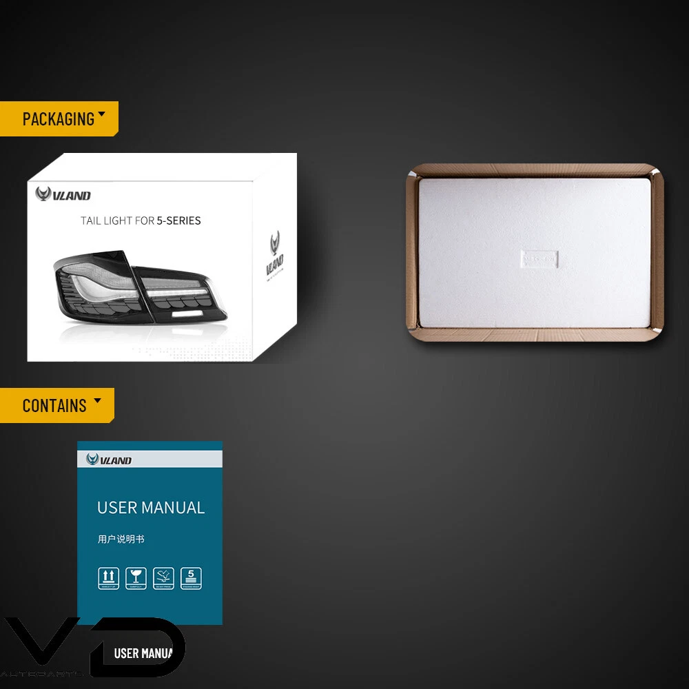 VLAND LED Taillights For 2011-16 BMW 5 Series F10 F18 Smoked Sequential Rear Set REPLACEMENT TAIL LIGHT With OE standards used throughout the manufacturing process, Replacement tail lights offer premium-level quality and peace of mind at an affordable price, ensuring your vehicle can be safely seen at night or in bad weather. fit: Fit For 6th Gen BMW 5-Series F10 F18 2011 2012 2013 2014 2015 2016 [520i, 523i, 528i, 530i, 535i, 550i, 518d, 520d, 525d, 530d, 535d]. 2012 2013 2014 2015 2016 Alpina B5/D5 Bi-Turbo Same style, different colors: https://www.ebay.com/itm/XXX/385988443556 Features & Benefits LED Fog Lights LED Turn Signals LED Reversing Lights LED Brake Lights Start-Up Animation Sequential Turn Signals Drop-In Fit Designed as a DOT/SAE-compliant direct replacement for your original tail lights. Plug-and-play wiring. Choose assemblies with bulbs. Superior, Lasting Visibility State-of-the-art design guarantees performance that delivers excellent visibility. Ultimate Quality & Safety Assurance Manufactured in ISO 9001:2000 and QS9000 certified facilities. Our quality control process ensures that all products meet strict standards for fitment and durability. Stands up to rigorous cycling tests and diligently tested in real-world conditions. Product Includes: 1 Pair of Tail Lights (Driver side&Passenger side ) User’s manual*1 NOTES Professional Installation is Highly Recommended. DEMO FUNCTION VIDEO (The video color is for reference only, and the physical object shall prevail) You May Also Like SHIPPING ABOUT PAYMENT RETURN SHIPPING ABOUT PAYMENT RETURN VLAND LED Taillights For 2011-16 BMW 5 Series F10 F18 Smoked Sequential Rear Set Store Categories Store Categories Toyota Category Ford Category Subaru Category Volkswagen Category Lexus Category Dodge Category Chevrolet Category BMW Category Mitsubshi Category Mazda Category Suzuki Category Tesla Category GMC Category Honda Category Jeep Category Hyundai Category Nissan Category Other PRODUCT DESCRIPTION REPLACEMENT TAIL LIGHT With OE standards used throughout the manufacturing process, Replacement tail lights offer premium-level quality and peace of mind at an affordable price, ensuring your vehicle can be safely seen at night or in bad weather. fit: Fit For 6th Gen BMW 5-Series F10 F18 2011 2012 2013 2014 2015 2016 [520i, 523i, 528i, 530i, 535i, 550i, 518d, 520d, 525d, 530d, 535d]. 2012 2013 2014 2015 2016 Alpina B5/D5 Bi-Turbo Same style, different colors: https://www.ebay.com/itm/XXX/385988443556 Features & Benefits LED Fog Lights LED Turn Signals LED Reversing Lights LED Brake Lights Start-Up Animation Sequential Turn Signals Drop-In Fit Designed as a DOT/SAE-compliant direct replacement for your original tail lights. Plug-and-play wiring. Choose assemblies with bulbs. Superior, Lasting Visibility State-of-the-art design guarantees performance that delivers excellent visibility. Ultimate Quality & Safety Assurance Manufactured in ISO 9001:2000 and QS9000 certified facilities. Our quality control process ensures that all products meet strict standards for fitment and durability. Stands up to rigorous cycling tests and diligently tested in real-world conditions. Product Includes: 1 Pair of Tail Lights (Driver side&Passenger side ) User’s manual*1 NOTES Professional Installation is Highly Recommended. DEMO FUNCTION VIDEO (The video color is for reference only, and the physical object shall prevail) ABOUT US PAYMENT SHIPPING RETURN FEEDBACK ABOUT US Have any questions or need info about something you already purchased? We'd love to hear from you! For items already purchased, please kindly include your eBay item number for faster response time. VDAutoparts operates from Monday through Friday, 10 am to 6 pm (PST). ATTENTION: We are closed on Sundays. All messages will be replied in the order it was received during business days Thank you for choosing VDAutoparts and happy bidding!! PAYMENT SHIPPING Shipping: Orders are generally dispatched in one business days (NOT including weekends)from cleared payment. Times for delivery will vary by region/country, please use the ETA delivery time shown on eBay as a rough estimate only (these are estimated time of arrival dates that are calculated by eBay not us), as the ETA delivery date displayed does NOT factor in weekends and local public holidays. VD AUTOPARTS is not liable for redelivery fees as a result of: a) Purchasers not being present at the time of an attempted delivery; or b) Purchasers failure to pick up an item from the carrier upon being notified of an unsuccessful delivery attempt by the carrier. Customers will be able to track their orders online, with the tracking information provided (via Ebay) once orders are dispatched. Where everything is made possible to ensure your delivery is dispatched promptly (currently 1 business days from cleared payment), we are however, not liable for transit delays, issues with couriers, natural disasters etc, that may occur and affect delivery times of your order (which will affect ETA delivery dates). VD AUTOPARTS do not take responsibility for broken or lost items via transit. These incidences can occur, but are rare, and we will do everything possible to assist you in the unfortunate event if it does. All items will be dispatched within 48 hours until payment cleared. Orders will be shipped from our Sydney warehouse directly. Most parcels can be delivered within 1-7 working days. We provide FREE POSTAGE or FLAT RATE POSTAGE to 99% areas in Australia-wide. However some faraway areas may not eligible. Seller will contact buyer if the item need extra shipping cost. We are not directly liable for any loss or damages on non-insured shipments.VD AUTOPARTS RETURN Return Policy **We stand behind the products we sell. If for any reason you are not satisfied with your purchase, we'll be happy to process a refund the product less S&H within 30 Days of your purchase. All return items will require a RMA number, which is given by our Customer Service Dep