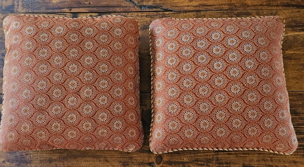 Pair Of Pier 1 Down Throw Pillow Reversible Medallion Striped Brocade 18"x 18" Great holiday colors. The pair is in excellent condition. Please see pictures for details and measurements.