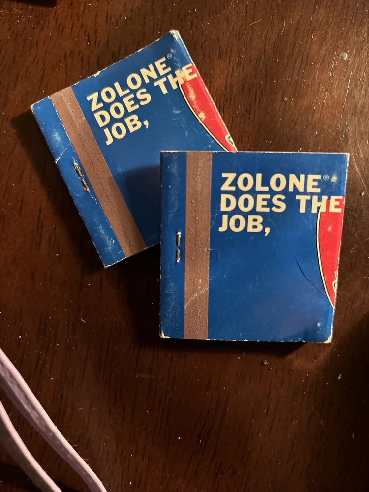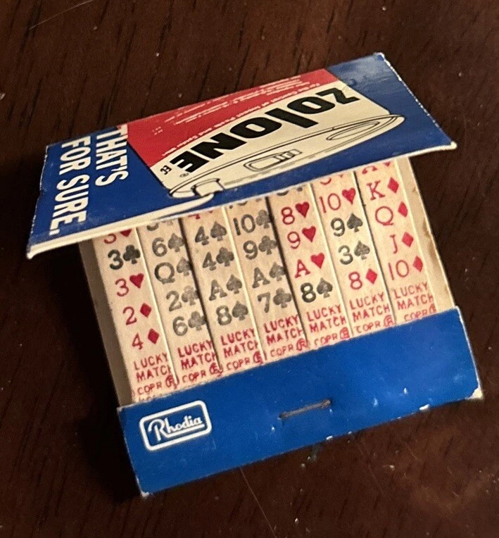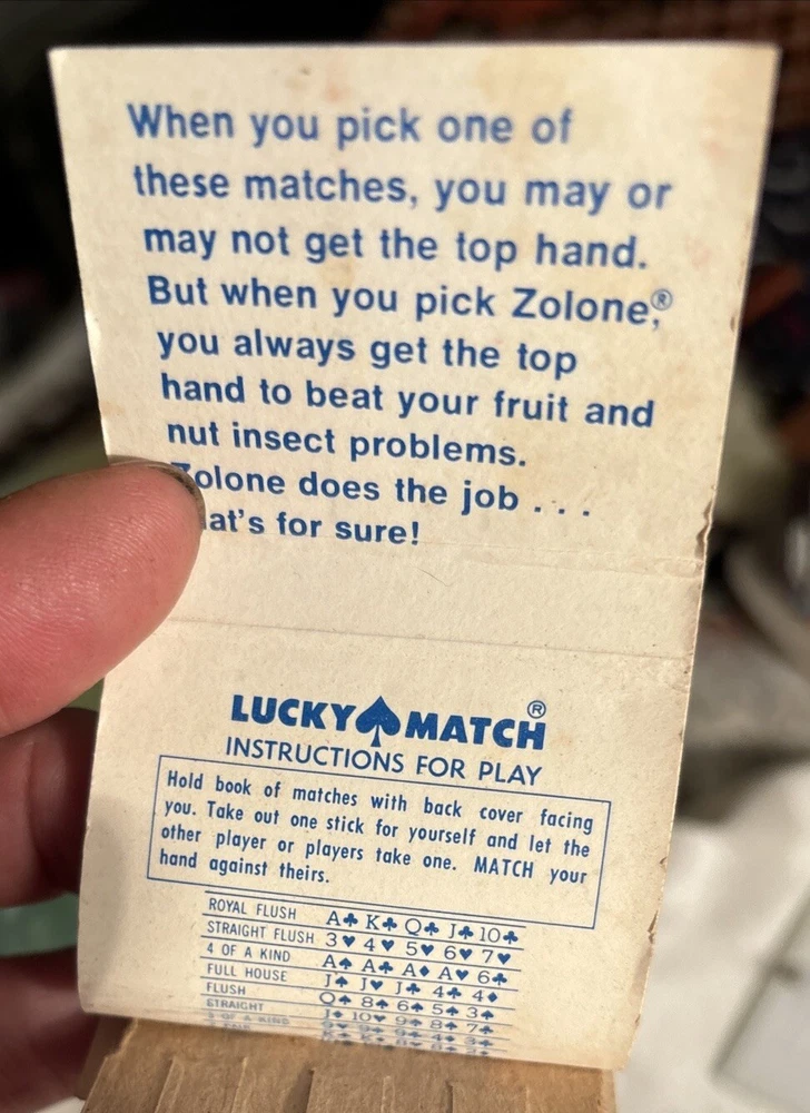 Pair of Vintage advertising matchbooks with poker hand matches inside. Playing guidelines to winning hands on inside cover. Rodia insecticide. Lucky Match