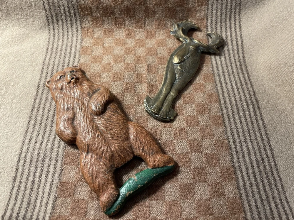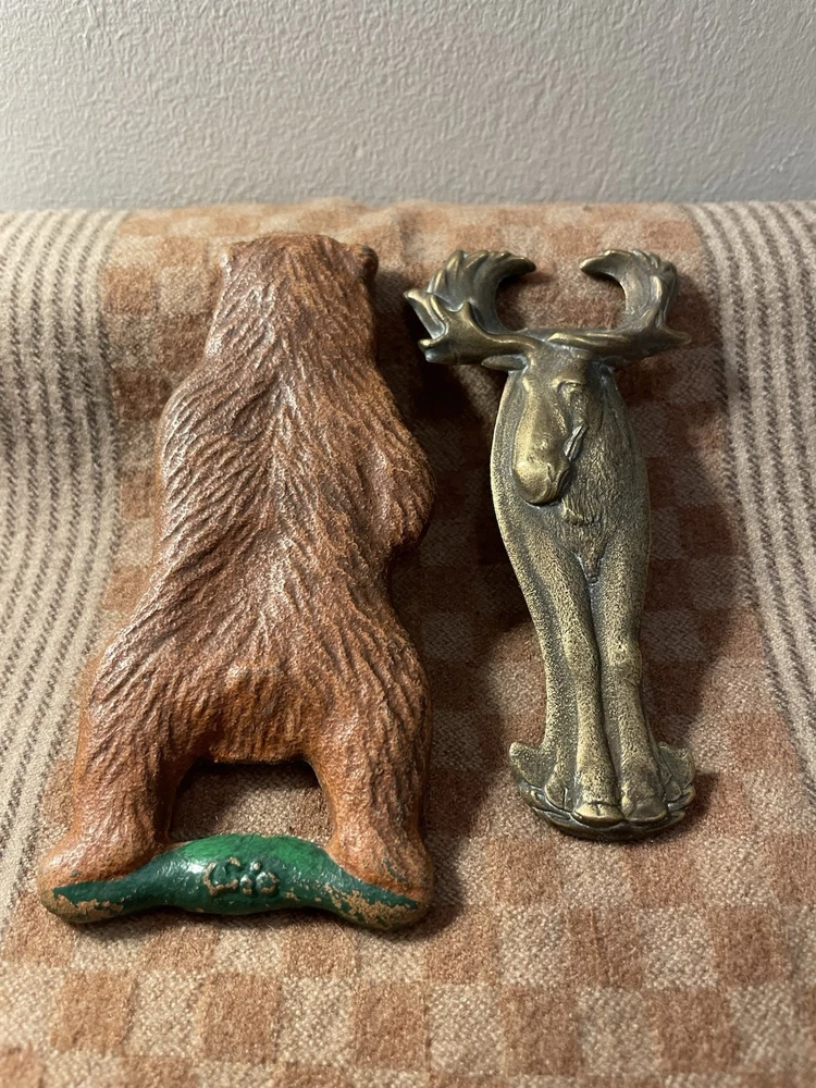 Pair Of Vintage Animal Metal Bottle Openers - Bear And Moose. In good condition. Bear opener has some paint missing, but that’s expected at his age. Moose is bronze and in great condition. These would be a great addition to any bar. Moose is about 4.5inches and Bear is 5inches.