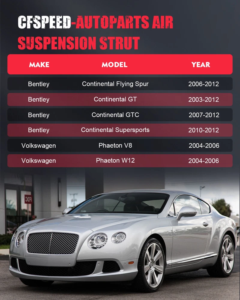 *OEM Part Number: Rear Left 3W0616001 3W0616001B 3W0616001C 3W0616001E 3W5616001 3W5616001A 3W5616001C 3W5616001D 3W7616001 3W7616001A 3W7616001C 3W7616001E 3W8616001 Rear Right 3W0616002 3W0616002B 3W0616002C 3W0616002E 3W5616002 3W5616002A 3W5616002C 3W5616002D 3W7616002 3W7616002A 3W7616002C 3W7616002E 3W8616002 *Item Specifications: Pair Rear Air Suspension Shock Strut For Bentley Continental GT GTC VW Phaeton *OEM Part Number: Rear Left 3W0616001 3W0616001B 3W0616001C 3W0616001E 3W5616001 3W5616001A 3W5616001C 3W5616001D 3W7616001 3W7616001A 3W7616001C 3W7616001E 3W8616001 Rear Right 3W0616002 3W0616002B 3W0616002C 3W0616002E 3W5616002 3W5616002A 3W5616002C 3W5616002D 3W7616002 3W7616002A 3W7616002C 3W7616002E 3W8616002 *Item Specifications: Key Words: Pair Rear Air Suspension Shock Strut For Bentley Continental GT GTC VW Phaeton Package Includes: Pair for Rear Left and Right Air Suspension Shock Strut Notes : Please double confim the compatibility as well as the OEM number before purchasing. Instruction is not included. Professional installation is recommended. *Compatibility Chart: 1, You can distinguish specific model of an automobile by VIN(Vehicle Identification Number). 2, VIN(Vehicle Identification Number) consists of total 17 English letters and arabic digits. 3, VIN does not include the letters I (i), O (o), and Q (q) (to avoid confusion with numerals 1 and 0). Bentley Continental Flying Spur Sedan 4-Door 6.0L 2006-2012 Flying Spur Speed Sedan 4-Door 6.0L 2009-2012 GT Coupe 2-Door 6.0L 2003-2012 GT Speed Coupe 2-Door 6.0L 2008-2010 GTC Convertible 2-Door 6.0L 2007-2012 GTC Speed Convertible 2-Door 6.0L 2010-2011 R Coupe 2-Door 6.8L 2003 Supersports Convertible 2-Door 6.0L 2011-2012 Supersports Coupe 2-Door 6.0L 2010-2012 T Coupe 2-Door 6.8L 2003 Volkswagen Phaeton V8 Sedan 4-Door 4.2L 2004-2006 W12 Sedan 4-Door 6.0L 2004-2006 * Generation & Evolution: Bentley Continental GT Grand Tourer Version First generation (2003-2011) Second generation (2011-2018) Third generation (2018-present) Bentley Continental GTC Convertible Version GTC First Version (2006-2009) GTC Speed Mulliner Driving Specification (2009-2011) GTC Speed 80-11 Editions (2010) GTC W12 (2011-2018) GTC V8 (2012-2018) Bentley Continental Flying Spur Four-Door Saloon First generation (2005-2012) Second generation (2013-present) Volkswagen Phaeton First generation (2002-2006) First Facelift 2007 Second Facelift 2010 *Platform Drive Layout : Bentley Continental Front-Engine, Rear-Wheel-Drive Layout Volkswagen Phaeton F4 Front-Engine Longitudinally-Mounted, 4Motion Four-Wheel Drive *Installation Guideline: 1.Installation is in the reverse order of air strut removal. Adhere to all manufacture's specifications for torque values. * Frequently Asked Questions : How to prevent the damage of air springs/How to extend the service life of air springs/struts etc.? An air strut with separable air springs If your vehicle offers a separable air suspension (Audi Allroad A6 C5, Mercedes-Benz W164, BMW X5, etc.), you should regularly (about once a week) lift the car to the maximum position, and remove dirt with a high-pressure cleaner (keep the cleaner at a distance to the air spring about 30 cm/12 inches, otherwise water pressure can damage the air spring). The highest position may vary depending on your model and regulation options. Therefore, please test this by trying the different modes available to you (Sport, comfort, dynamic, off-road) and choose the one that sets your vehicle to the highest position. The dirt will most likely be found under the fold of the pneumatic chambers. If you find a frozen layer of bitumen on the piston guide (the part of a strut on which the air spring is installed), it is recommended to clean it as well. Whenever possible, avoid riding on fresh asphalt, as fresh bitumen mixed with sand immediately results in a build-up of abrasives on the piston and in turn contributes to accelerated wear and tear of the air spring. A complete air suspension shock Many cars such as Mercedes W220 or W211 are set up with a complete air strut - shock absorber and air spring visually form a complete spare part. In many cases, you can easily recognize these by the metal cups with which the air spring is tightly mounted. To best avoid any damage, we highly recommend to regularly check the condition of the dust protection seals of the air strut. What is the difference between an air spring and an air strut? The air spring is a part of the air strut. Some vehicles (e.g. Mercedes ML) allow you to change the air spring separately. At our online shop you have the opportunity to buy either the whole air strut or only the air spring. For some type of vehicles it is not possible to change the air spring separately. In this case the whole air strut should be replaced. Which side of my car is the Right and Left? The right and left sides of an automobile are determined as if sitting in the car facing forward. Thus, the left side is on the left when sitting in the car facing forward, and the right side is on the right. For American cars, the driver’s side is on the left, and the passenger sits to the right of the driver. For cars in Japan, Britain, Ireland, the Bahamas and some other former British colonies -- where they drive on the left side of the road -- the passenger sits on the left side, and the driver (along with all the driving controls) is on the right. Item Specifics Placement on Vehicle Right Rear Left OE/OEM Part Number 3 3W7616002C 3W7616002E 3W8616002W0616001 3W0616001B 3W0616001C 3W0616001E 3W7616002A Single Weight(KG) 7.890 Included Hardware None Maximum Operating Pressure (psi) 195 Minimum Operating Pressure (psi) 90 Drive Layout Front Engine RWD & 4WD Platform D1 Material Iron Aluminium Alloy Rubber Color Silver Black Type Air Suspension Shock Custom Bundle No Return Policy 30 Days Free Return Manufacturer Warranty 1 Year Quantity 2pcs Fitment Type Direct Replacement OE Spec or Performance/Custom OE Spec Adjusta