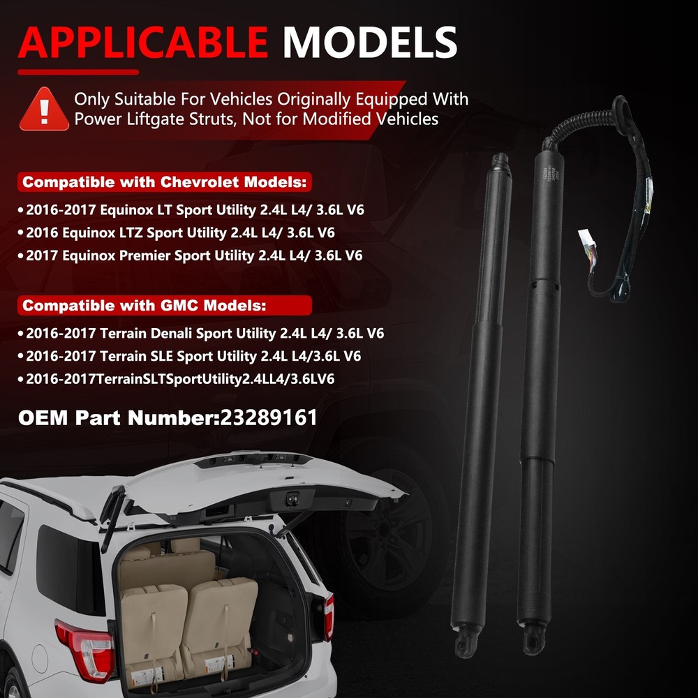 Store Categories Store Categories O2 Sensors Backup Camera TPMS Power Tailgate Strut AC/Heater Climate Control Other Cowtotal Autoparts,Your Best Aftermarket DIY & DIFM Partner. Product Description Pa cka g e includes: Set Of 2 Electric Power Tailgate(Left & Right Side ) Fitme nt : (For Reference Only) Chevrolet Equinox LT 2016-2017 Sport Utility Chevrolet Equinox LTZ 2016 Sport Utility Chevrolet Equinox Premier 2017 Sport Utility GMC Terrain Denali 2016-2017 Sport Utility GMC Terrain SLE 2016-2017 Sport Utility GMC Terrain SLT 2016-2017 Sport Utility Features: 100% test before shipping to ensure product safety, stability and durability. OE Qualify Guaranteed.From manufacturer that maintains complete strict quality control. Direct-fit replacement ensures proper fit, form, and function. Plug and play design ensures ease of installation. Designed to meet Federal Safety Standards. Specifications: Condition: Brand New & Perfect Packed Quantity: 2 Power Struts PartNumber:23289161,84131470 94440, 94441 84569355,84133944 N ote: Pleas e Check Carefully To Make Sure the OE Number And Picture are Exactly Listed Are The Same As Your Orignal One. If You are Not Sure Whether It Fits, Please send VIN number to us. No Instruction Included, professional installation is highly recommended . Payment Policy Shipping Policy Returns Policy Warranty Payment Policy 1. We accept Paypal, Credit Card, Veno,Goggle Pay,American Express,Discover, Direct Debit, VISA, eCheck, or othe r methods, please kindly check Paypal for more information. 2. For multiple purchases, please add items to your Ebay shopping cart and pay once for entire order. Shipping Policy 1. All items will be shipped to buyer's ebay address. 2. All items will be shipped within 24 working hours upon receipt of payment, and multiple items might be combined shipping. 3. In most cases, delivery takes around 3-7 business days, it's highly depended on the efficiency of the shpping carrier. If your item doesn't arrive on time, please contact us immediately for further assistance. Please note there is no local pickup service available. 4. We do appreciate your purchase here. If you are astisfied with the item as well as our service, please kindly leave us a Positive Feedback to help develop our bu siness. Th ank you in advance. Returns Policy We have a friendly and dedicated customer support teams to handle any problems you come up with our products. Please contact us first via email or message for replacement, refund or technical problem caused by any reason. Warranty 30 Days Free Return and Money Back Guarantee. If you are not satisfied with your purchase, you can return the item with original packaging back to us for full refund, not any re-stock fee. The return cost should be paid by buyer. 5 Year Unl imited Mileage Quality Guarantee If you receive any w rong items, or damage during the transportation or defect items, we will accept the return and pay the return freight. Please noted that the return cost should be prepaid by buyer, we will issue the refund of return cost to buyer after inspecting the faulty item. The full refund or replacement will be available for all faulty items, including the original shipping cost. Please kindly contact us b efore return, our representatives will send you the detailed return instruction. The guarantee will be only for the cost of the item, we will not responsible for installation or other fees like labor expenses, towing expenses, additional repair expenses or other related expenses. Copyright © 2023 Dianxiaomi