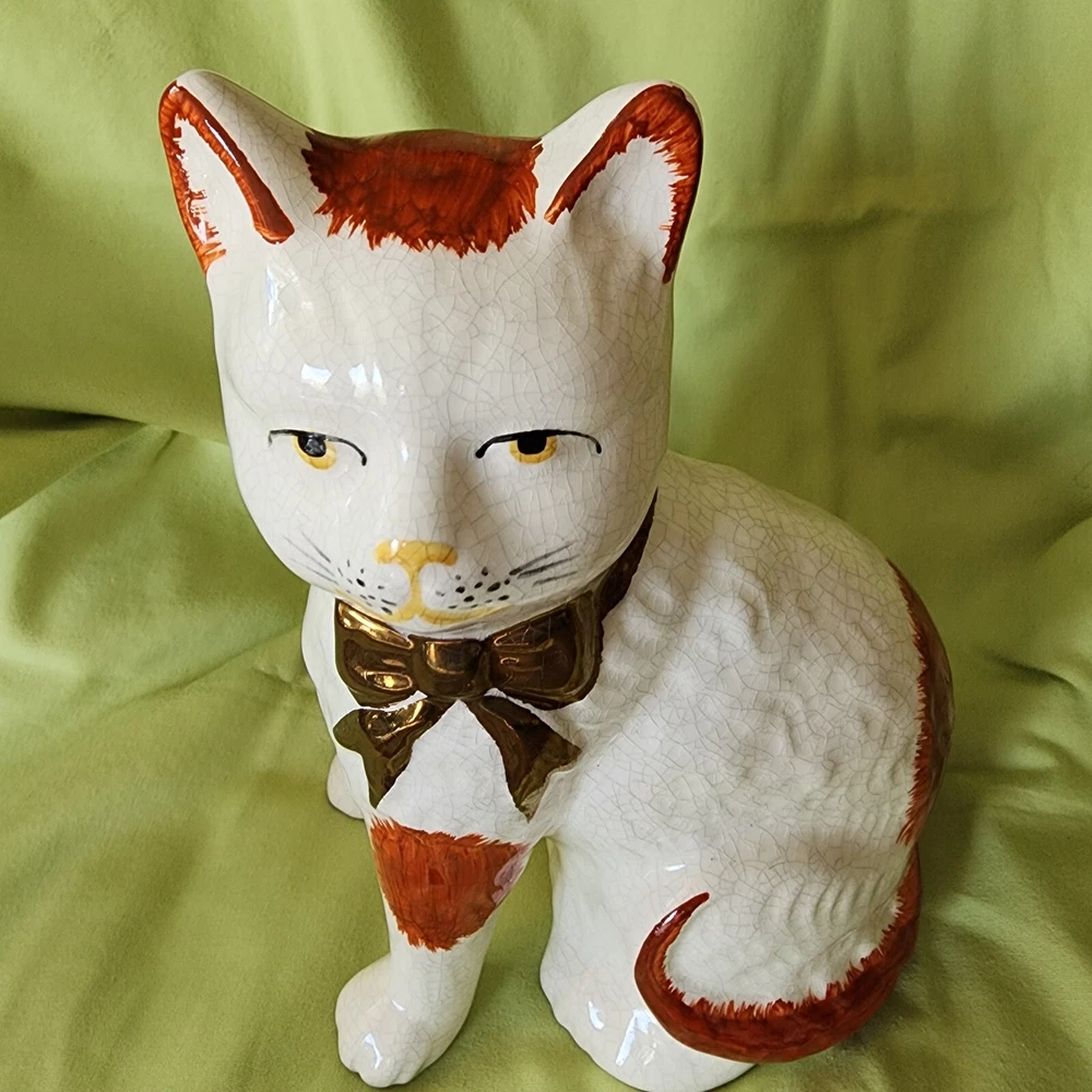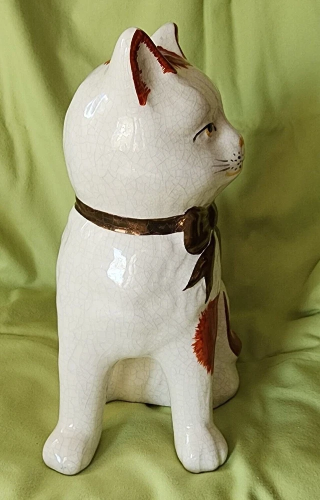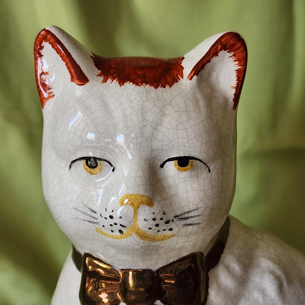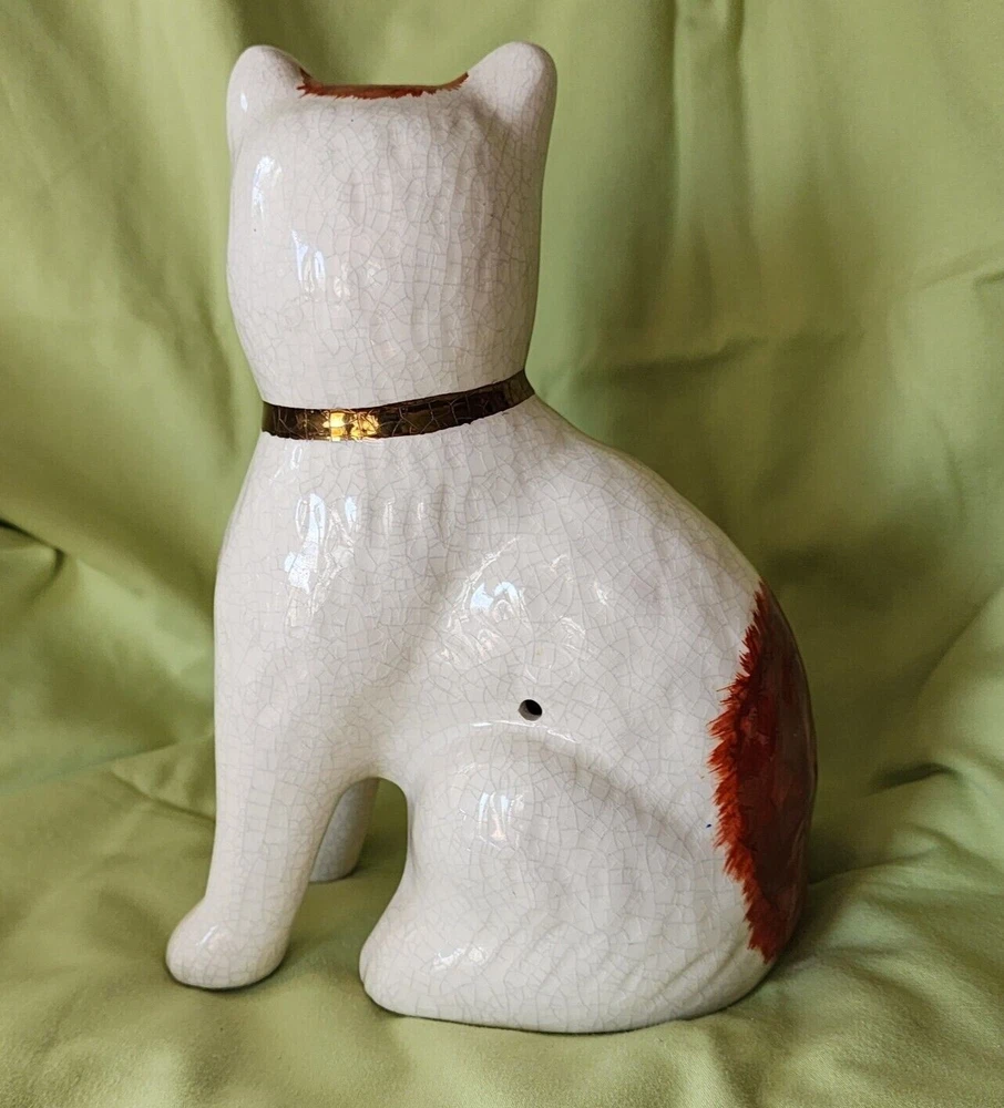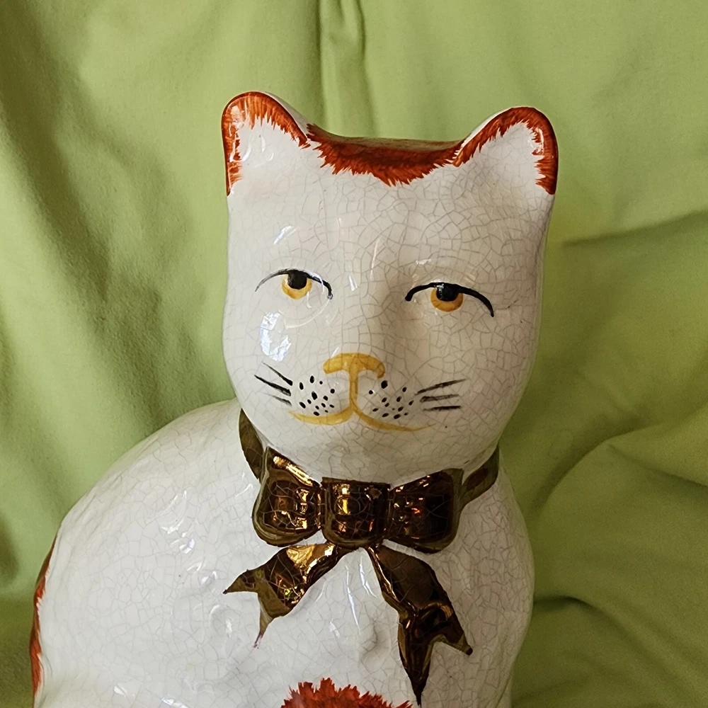 Pair of antique Staffordshire Ware Kent Ceramic Cat Figurines formantle or bookcase. Made/hand painted in Staffordshire England - unmarked. White with ginger/red coloring; shiny copper-color bows. In excellent used condition. All over fine crazing lines asusual for these figurines. All paint intact; one spot on tail of left-facingcat is a factory paint skip (as shown in photo). Please view all pictures as part of the description. Height: 8” Width: 6” Depth: 4” These are lovely and a charming addition to any décor –traditional, Victorian, Arts & Crafts, mid-Century – even whimsical for modern/contemporary. Enjoyed and displayed in a smoke-free home for many years.