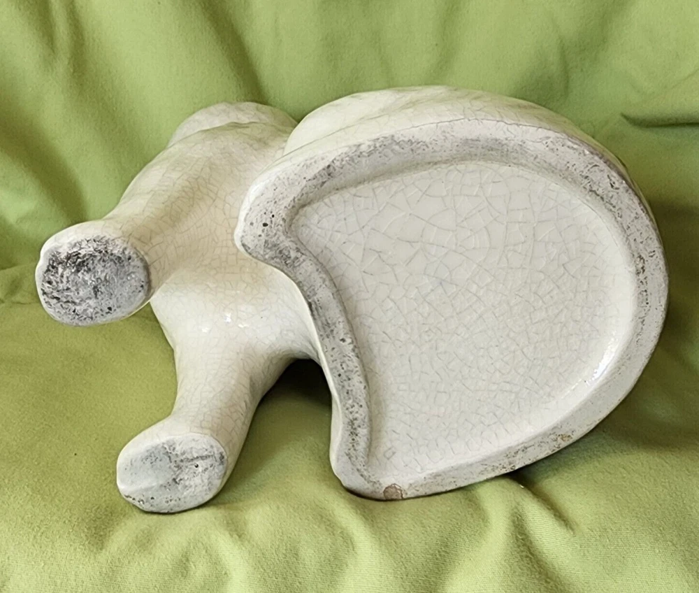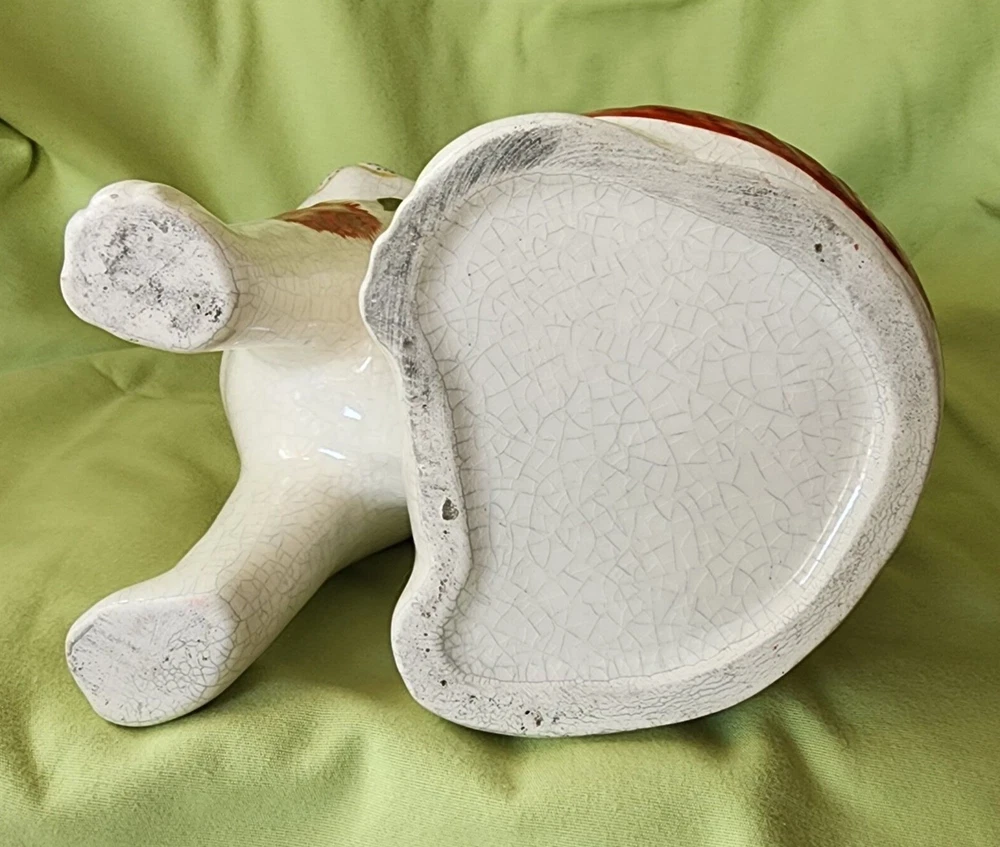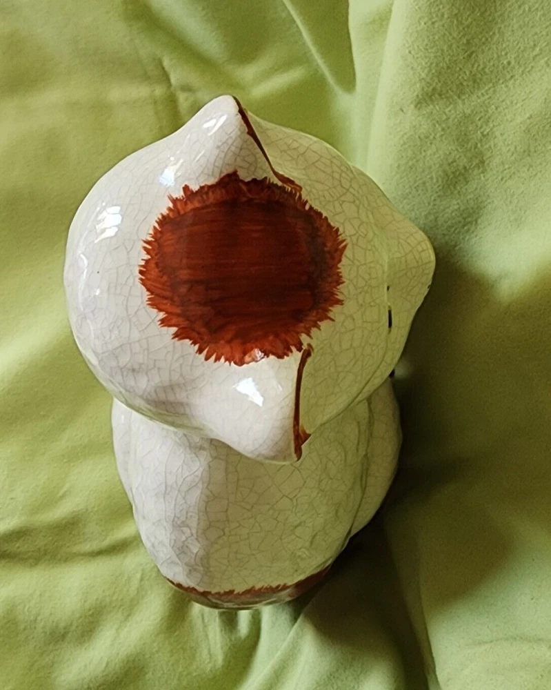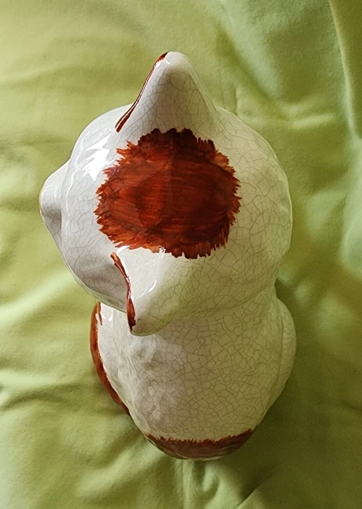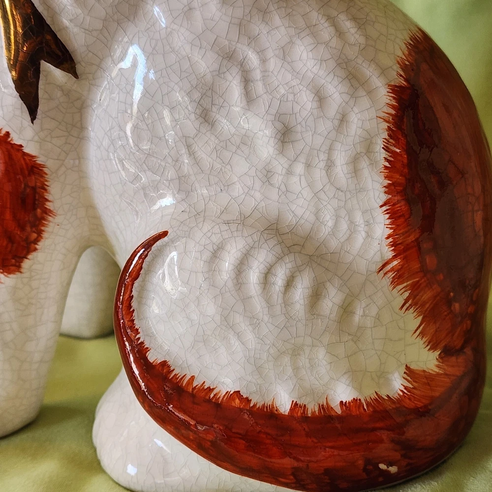 Pair of antique Staffordshire Ware Kent Ceramic Cat Figurines formantle or bookcase. Made/hand painted in Staffordshire England - unmarked. White with ginger/red coloring; shiny copper-color bows. In excellent used condition. All over fine crazing lines asusual for these figurines. All paint intact; one spot on tail of left-facingcat is a factory paint skip (as shown in photo). Please view all pictures as part of the description. Height: 8” Width: 6” Depth: 4” These are lovely and a charming addition to any décor –traditional, Victorian, Arts & Crafts, mid-Century – even whimsical for modern/contemporary. Enjoyed and displayed in a smoke-free home for many years.