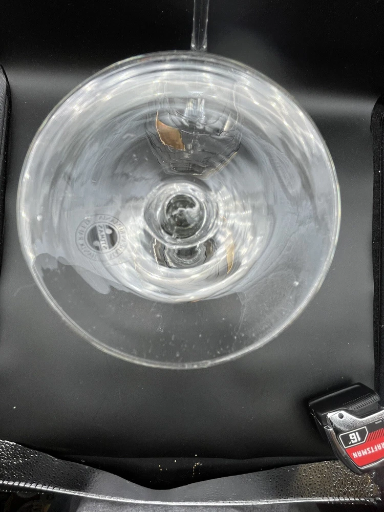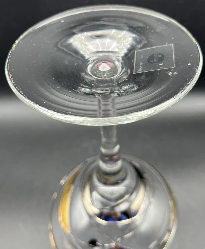 Pair of Stimas Romania 8” Tall Stemware Stained Glass Red Wine Glasses, hand-blown and decorated with an abstract design. The set includes two red wine glasses, perfect for all occasions. Made of glass, the contemporary style glasses feature a round shape and stand 8 inches tall and 8.25” tall. Each glass is adorned with a unique abstract pattern, adding a touch of elegance to your dining experience. Original sticker.
