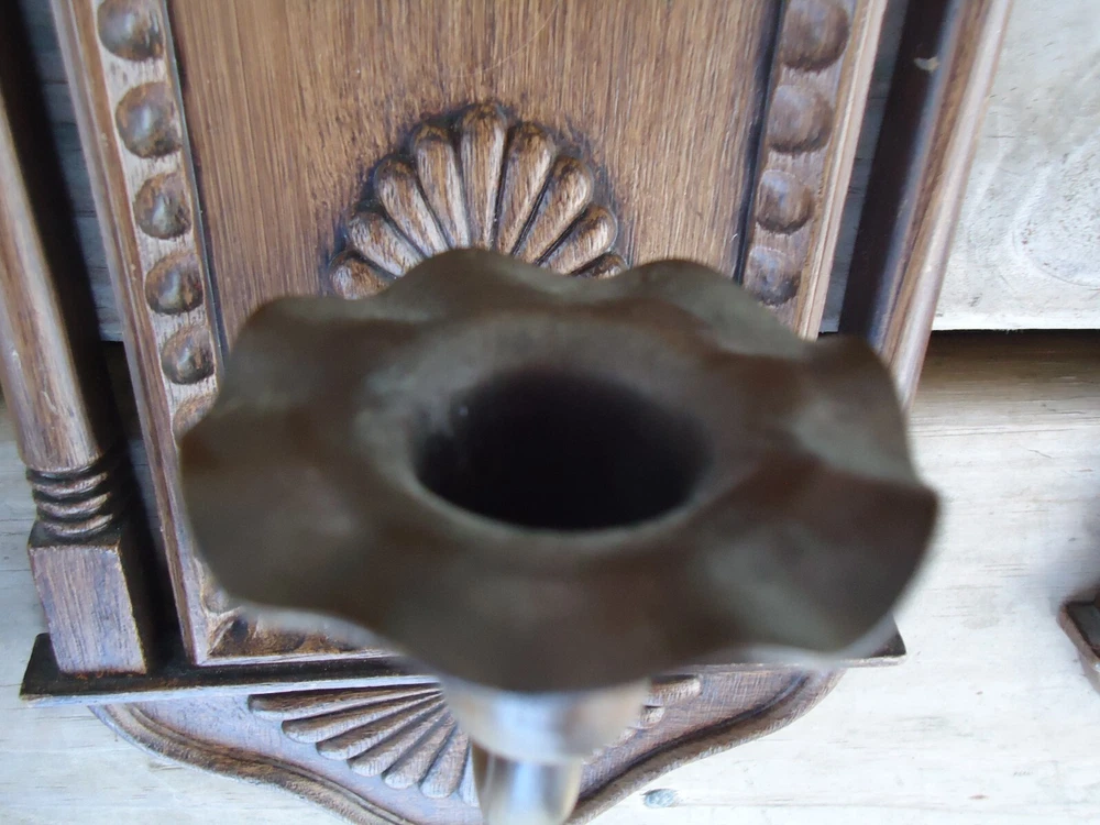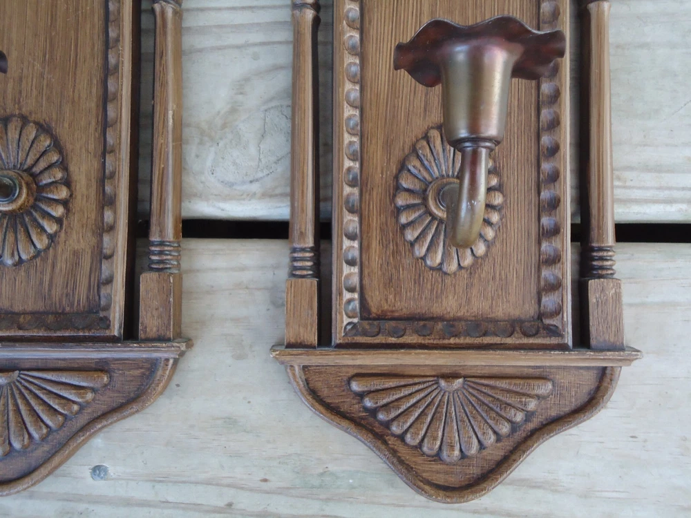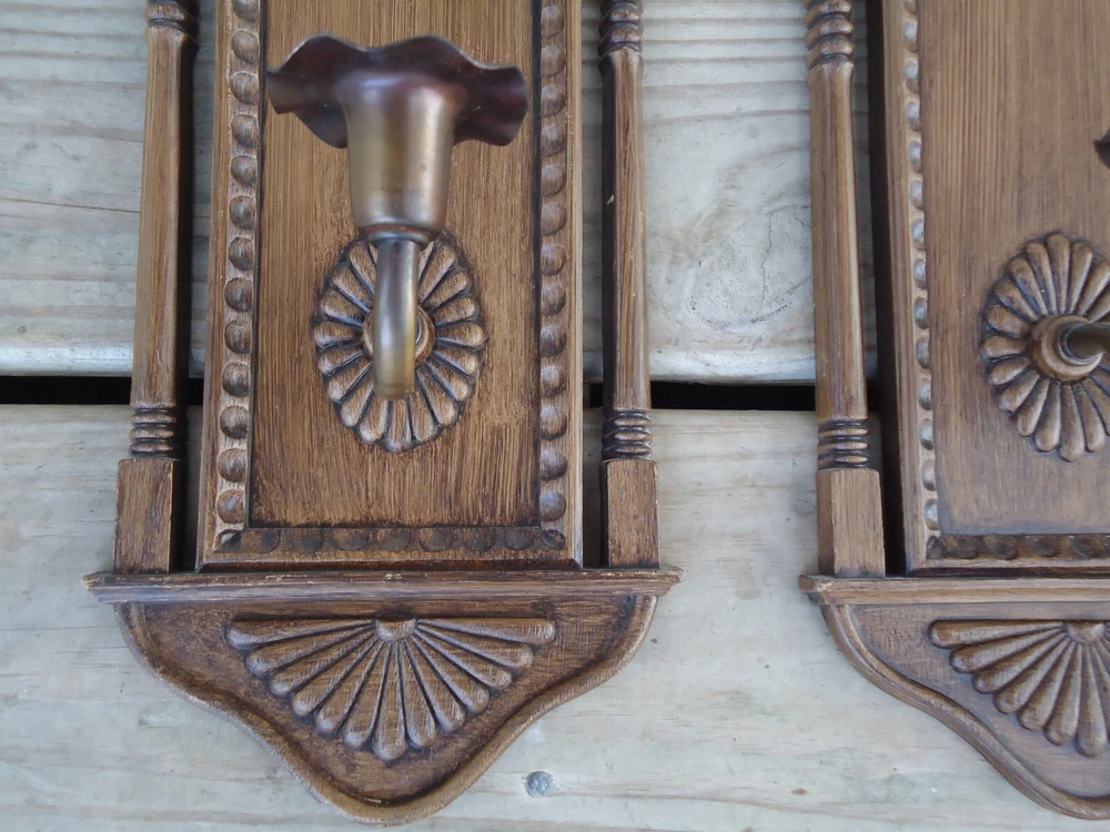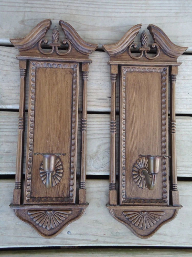 Pair VTG Wall Sconce Candle Holder Hanging Decoration Faux Wood 70s Library Hall