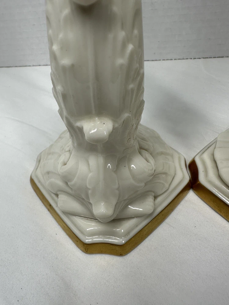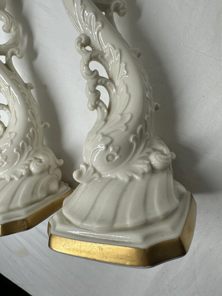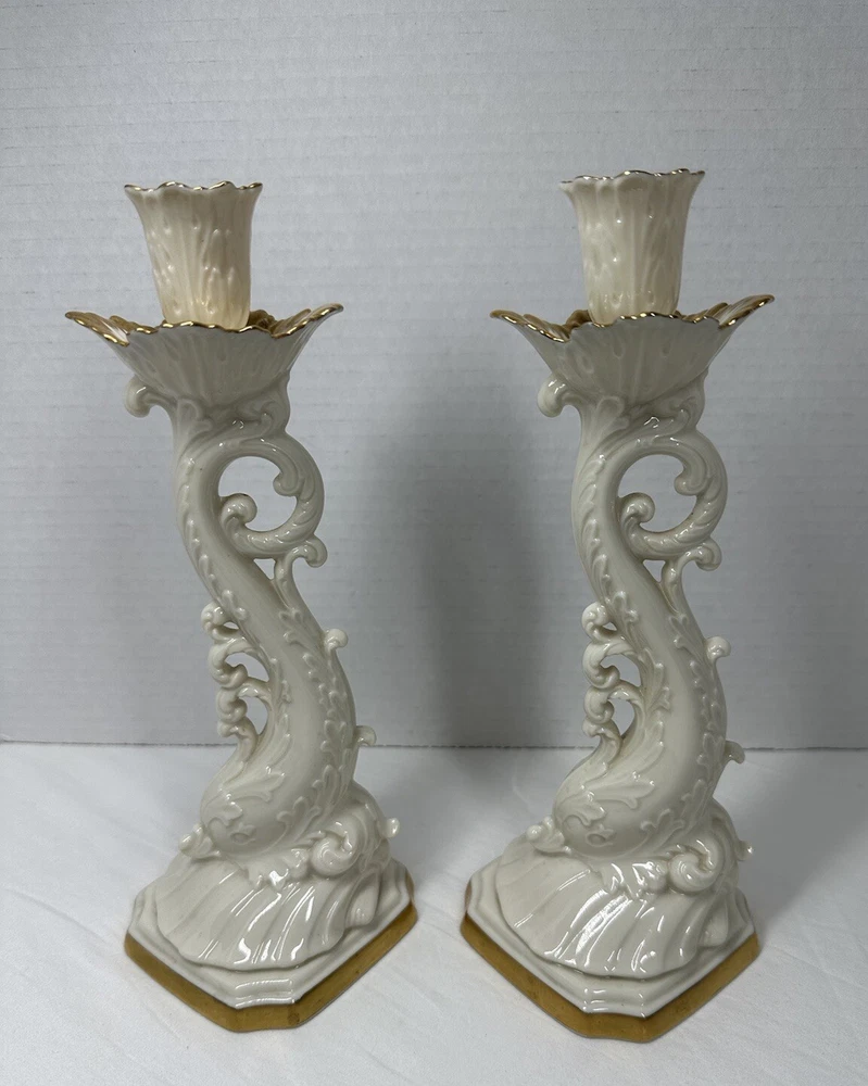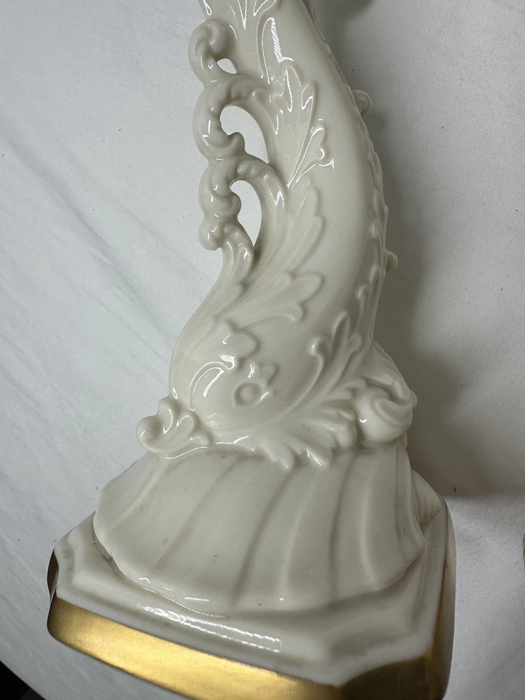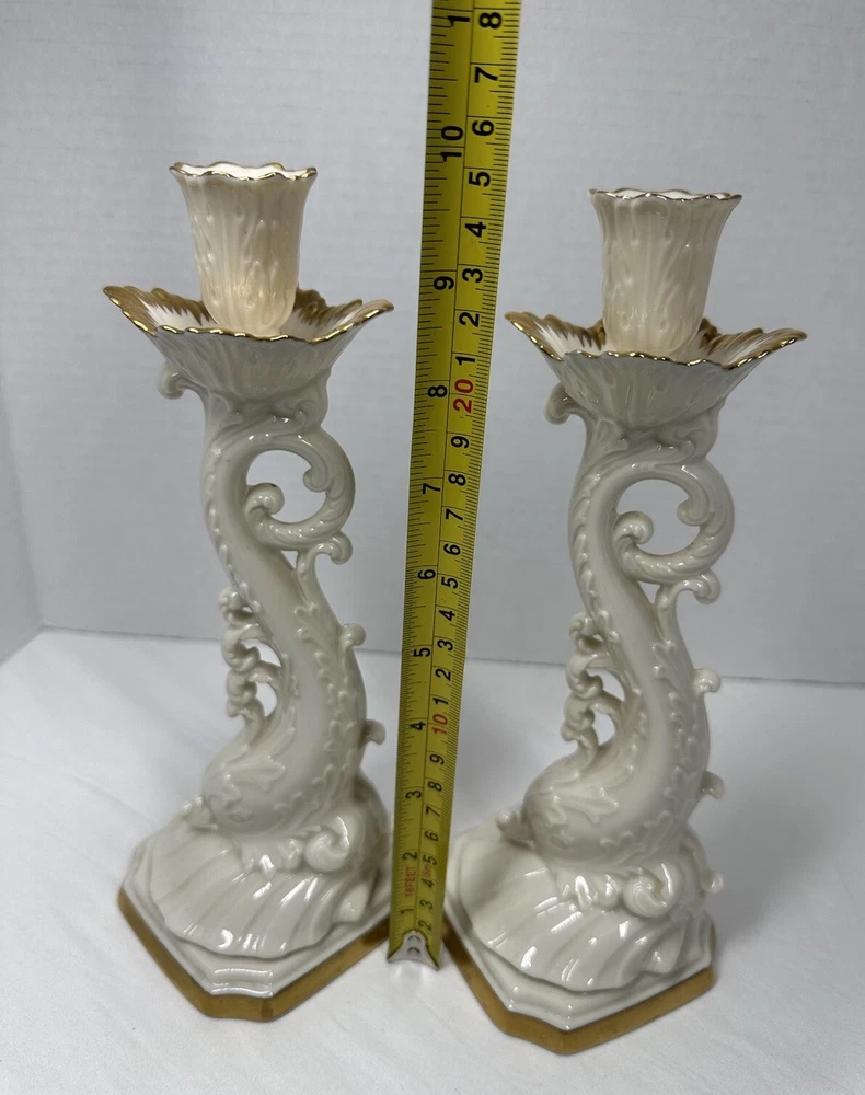 Pair Vintage Lenox Dolphin Tall Candle Holder With 24 K Gold Trim 10”