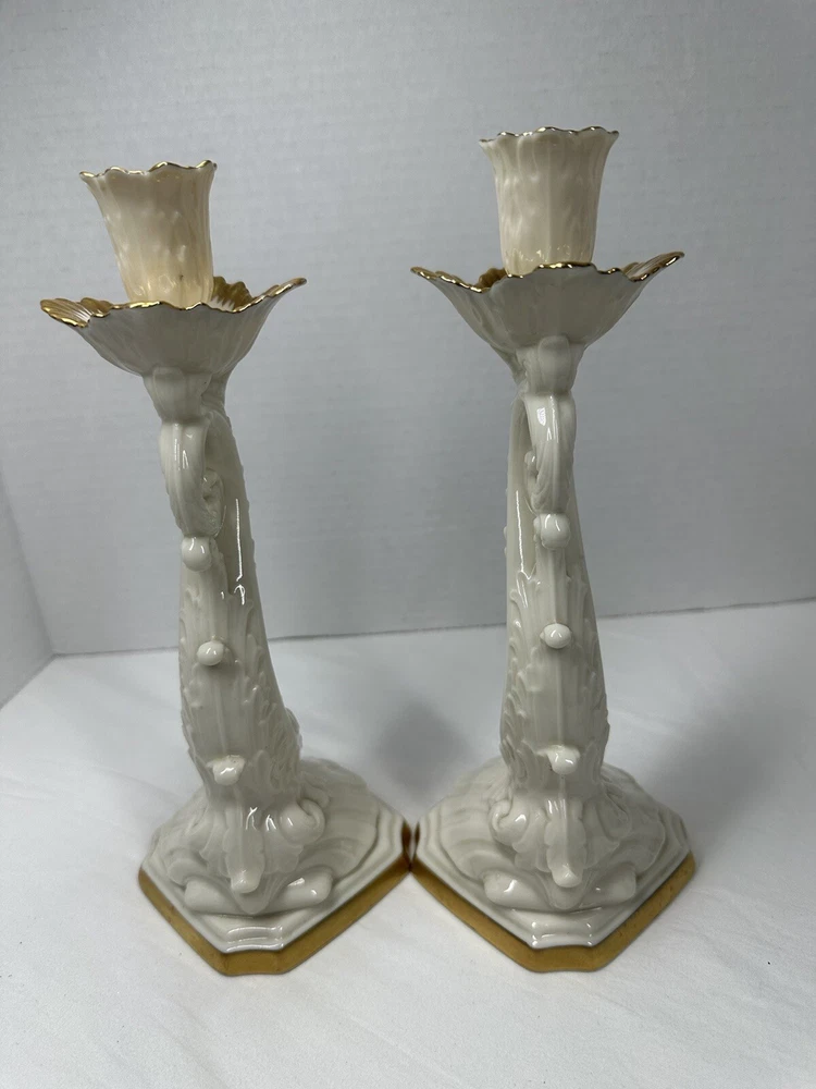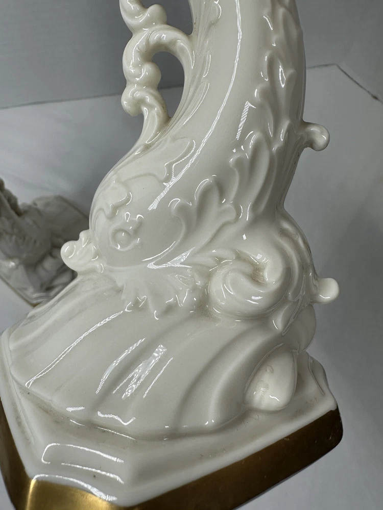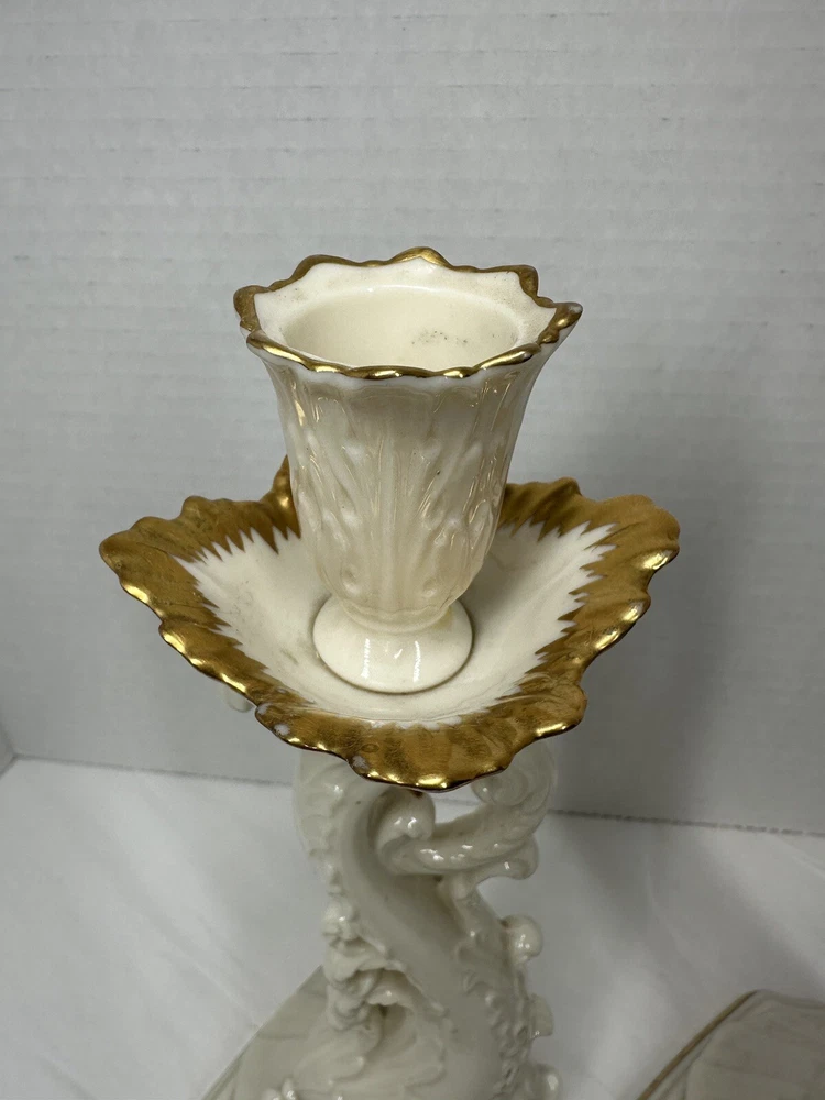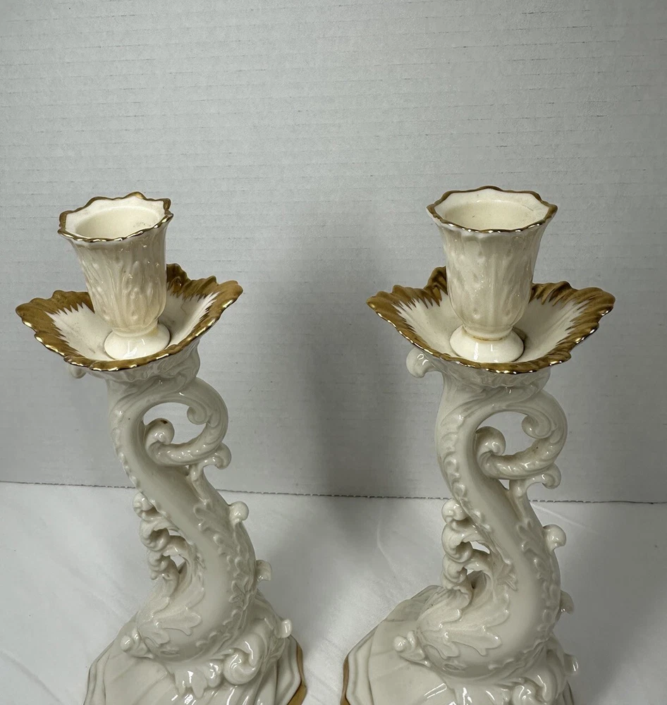 Pair Vintage Lenox Dolphin Tall Candle Holder With 24 K Gold Trim 10”