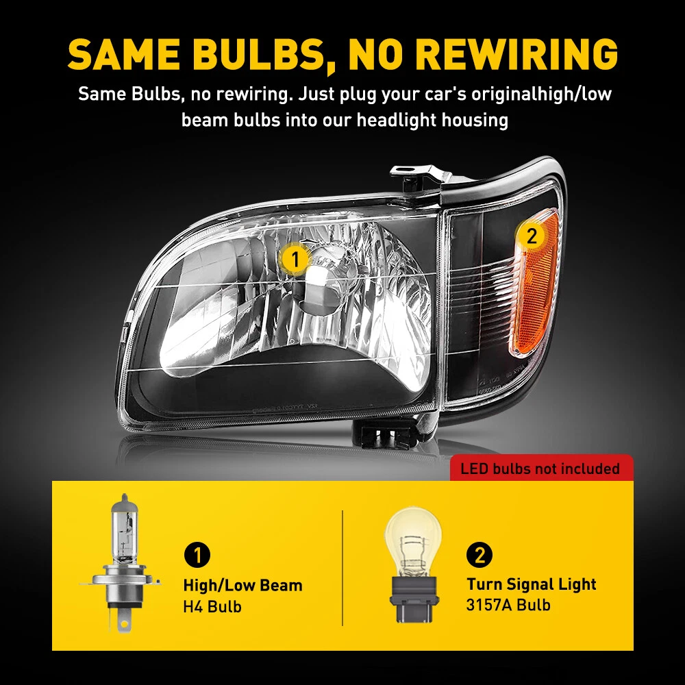 Black Headlights Fits 2001-2004 Toyota Tacoma Quad Lamps Left+Right Fit for: 2001-2004 Toyota Tacoma Specifications: OE number: 8115004110, 881150-04110, 81110-04110 TO2502136, TO2503136 Material: ABS+PC (ABS Plastic Housing/Polycarbonate lens) Appearance color: CLEAR LENS、BLACK HOUSING Fitment Type:Direct Fitment Attention: Halogen bulbs are not included. Features: *Easy to install: Direct replacement, drilling or cutting are not required. *Superior quality: ABS+PC materials with toughness and heat resistance functions. *Superior visibility: Pair for 2001-2004 Toyota Tacoma Clear Lens Halogen Headlights + Signal Lights Black Headlights Fits 2001-2004 Toyota Tacoma Quad Lamps Left+Right Fit for: 2001-2004 Toyota Tacoma Specifications: OE number: 8115004110, 881150-04110, 81110-04110 TO2502136, TO2503136 Material: ABS+PC (ABS Plastic Housing/Polycarbonate lens) Appearance color: CLEAR LENS、BLACK HOUSING Fitment Type:Direct Fitment Attention: Halogen bulbs are not included. Features: *Easy to install: Direct replacement, drilling or cutting are not required. *Superior quality: ABS+PC materials with toughness and heat resistance functions. *Superior visibility: High grade lens offers better visibility, a great brighter alternative to old dim or yellow headlights. *Light leveling adjuster: Aligned headlights ensure to shine on the road with maximum visibility and road safety. Note: 1.Please confirm the OE number before purchasing!!! 2.Professional installation is required!!! Packaging include: Headlights*2(left+right) Bumper Light (left+right) Item Specifics Mounting Style Screws Bulbs Included No. Reuse Existing Bulbs Fitment Type Direct Replacement Items Included Driver & Passenger Side Headlgihts Manufacturer Part Number DDZC-MUSTANG-99-04-BA Material ABS Plastic / Polycarbonate Lens Superseded Part Number SDD-HLOHFM99BKAM Placement on Vehicle Front, Left, Right Brand AUXITO Bulb Shape Code 9007 High / Low Beam Type Headlight Assembly Interchange Part Number 1999 2000 2001 2002 2003 2004 99 00 01 02 03 04 Parking Light 3157A OE/OEM Part Number FO2503160 FO2502160 FO2503177 FO2502177 2002 2003 2004 00 01 02 Housing Color Black Style OE Features Factory Headlights, Reflector Housing Lens Color Clear Lens / Amber Reflector Turn Signal 3157A Lighting Technology Halogen UPC DOES NOT APPLY Payment Returns DESCRIPTION PAYMENT SHIPPING RETURN POLICY CONTACT US Shop Category Store Home LED Headlight ◈ H4 ◈ H13 LED Reverse Light ◈ T15/921/W16W LED License Plate Light LED Side Marker Light Car Parts & Accessories Tail Light assemblies Other Hot Item Picture New List Item 20000LM H7 LED Beam Kit Super Headlight Bulbs Low White 6000K Customized Lamps A USD 23.59 Rectifier Regulator for 07 09 08 Polaris Ranger 500 700 4X4 6X6 4011925 4012384 USD 47.99 For Chevy Tahoe Suburban 2015-20 Headlights Assemblies W/Projector USA USD 249.99 Black Fits 2012-15 Honda Civic 4Dr Sedan 12-13 Civic 2Dr Headlights Head Lamps USD 109.99 For 2016 2017 2018 2019 Tacoma Headlights Headlamps w/o LED DRL Left+Right Pair USD 119.99 Help & Info Payment Policy Shipping Policy Return Policy FAQ About Us Pair for 2001-2004 Toyota Tacoma Clear Lens Halogen Headlights + Signal Lights Black Headlights Fits 2001-2004 Toyota Tacoma Quad Lamps Left+Right Fit for: 2001-2004 Toyota Tacoma Specifications: OE number: 8115004110, 881150-04110, 81110-04110 TO2502136, TO2503136 Material: ABS+PC (ABS Plastic Housing/Polycarbonate lens) Appearance color: CLEAR LENS、BLACK HOUSING Fitment Type:Direct Fitment Attention: Halogen bulbs are not included. Features: *Easy to install: Direct replacement, drilling or cutting are not required. *Superior quality: ABS+PC materials with toughness and heat resistance functions. *Superior visibility: High grade lens offers better visibility, a great brighter alternative to old dim or yellow headlights. *Light leveling adjuster: Aligned headlights ensure to shine on the road with maximum visibility and road safety. Note: 1.Please confirm the OE number before purchasing!!! 2.Professional installation is required!!! Packaging include: Headlights*2(left+right) Bumper Light (left+right) Payment Returns All rights reserved. On Dec 15, 2024 at 08:54:44 PST, seller added the following information: