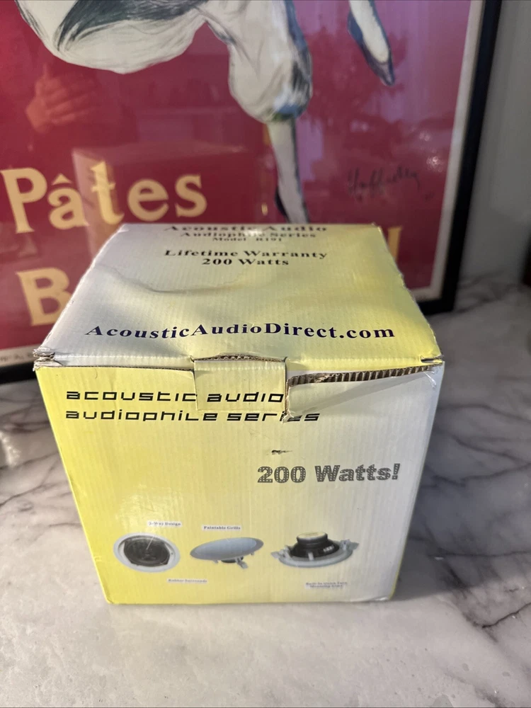 The product is a pair of Acoustic Audio by Goldwood r191 in-ceiling speakers with a driver size of 5.25 inches. These sphere-shaped, frameless white speakers have a wired connectivity, RMS power of 200W, and an impedance of 8 Ohms. The set includes two speakers suitable for home audio setups.
