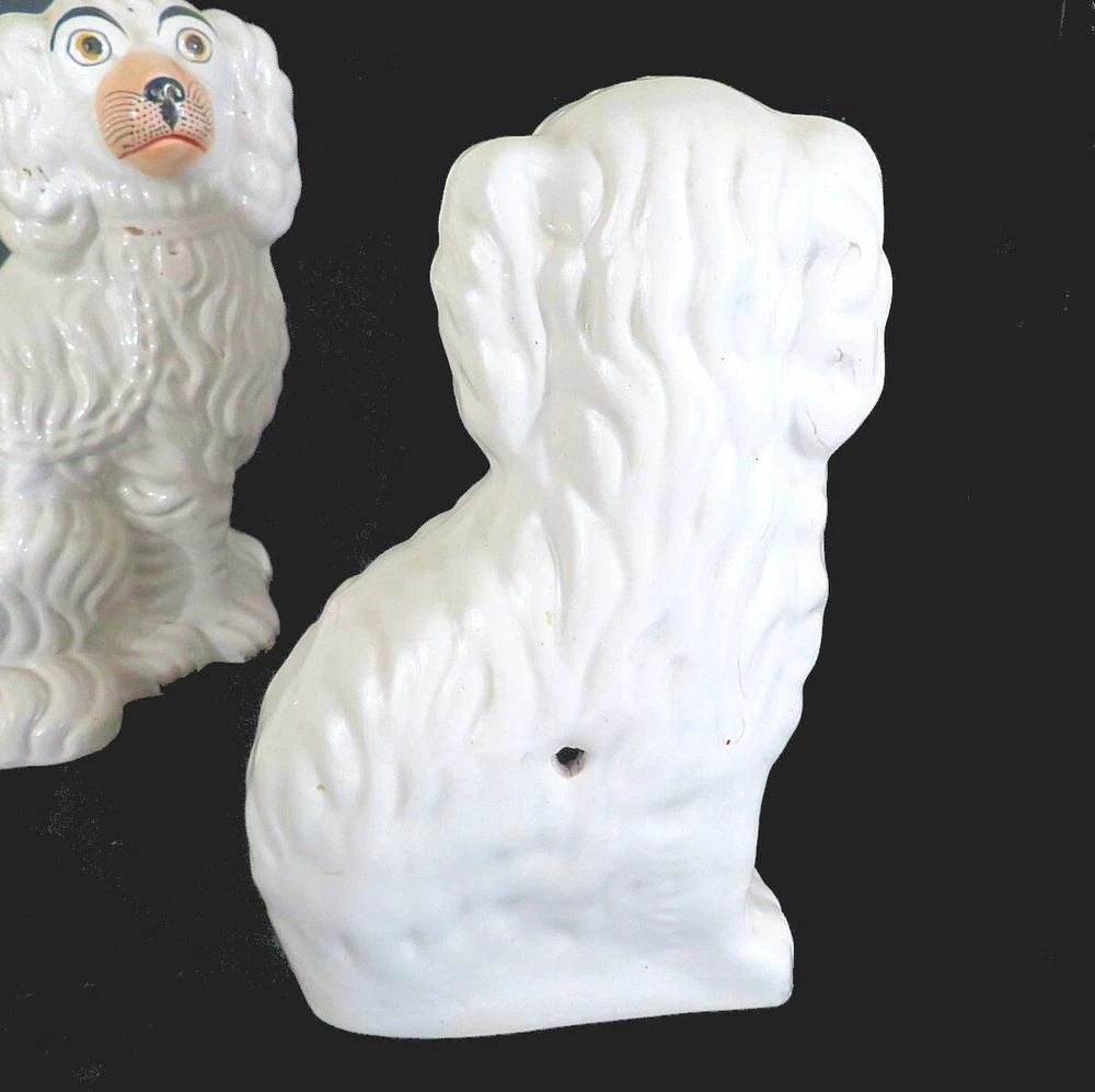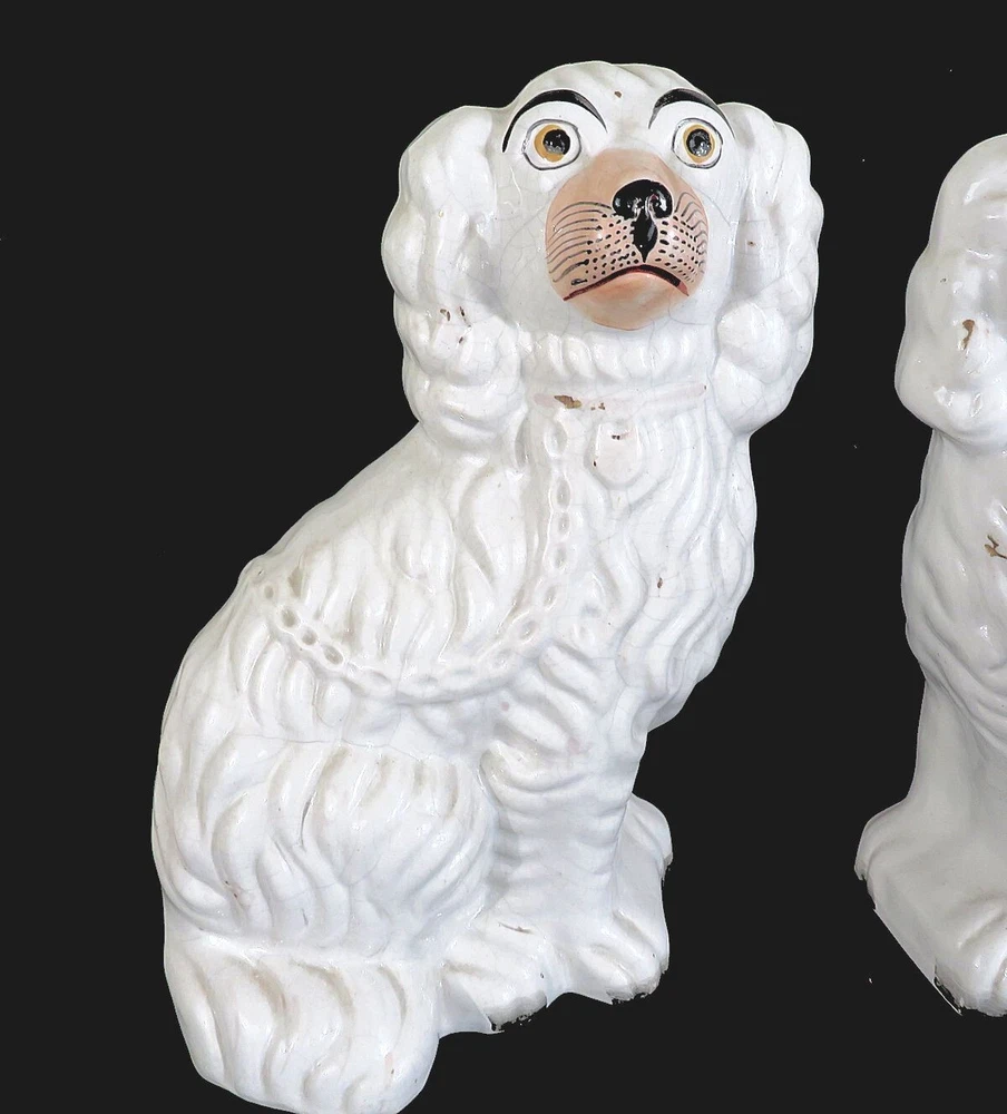A pair of 19th century white Staffordshire hearth/wally dogs. 10" tall. There is loss of gold paint on both. One is undamaged. The other has crazing and some apparent faint hairlines and a firing crack along the mold line on the head. They still display well. SEE PHOTOS. SOLD AS IS. Priced accordingly.