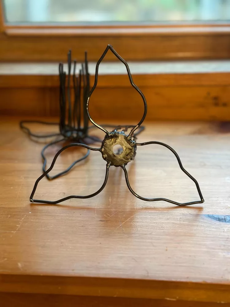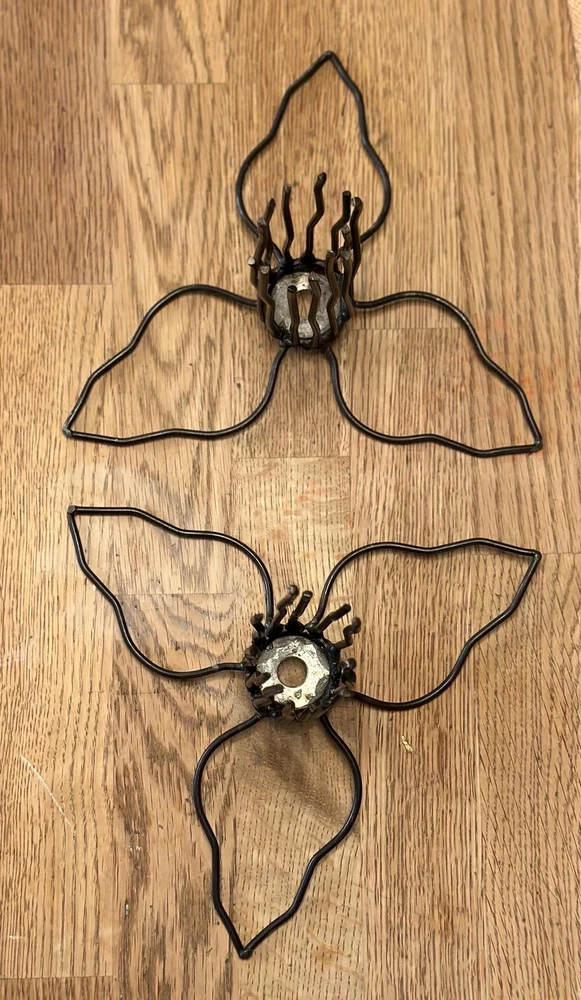 Unique pair of iron candle holders shaped like flowers. Each measures 4.5” tall x about 7” across. The opening is about an inch but could be adjusted just a bit. To prevent wax from getting everywhere I would consider using a fake taper candle like in the image or a set of drip rings.