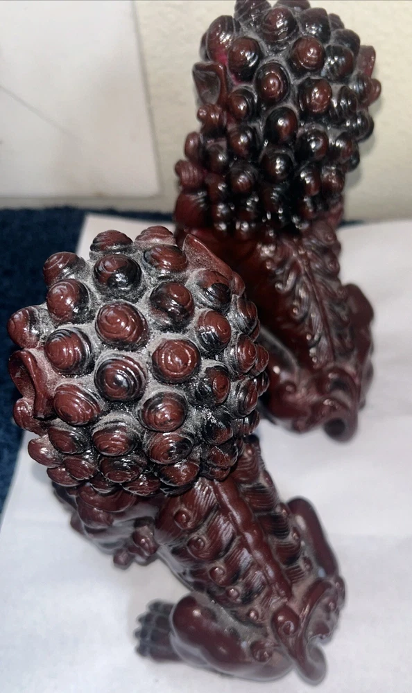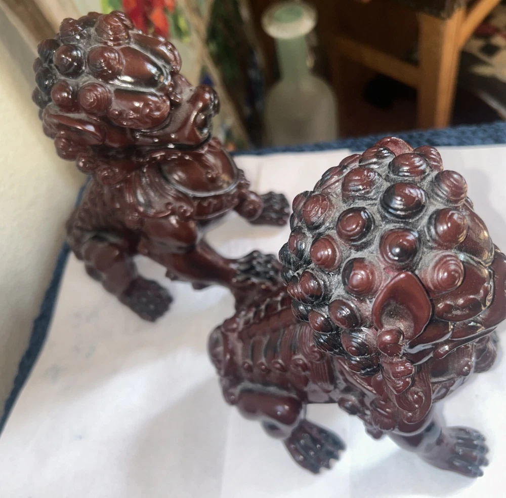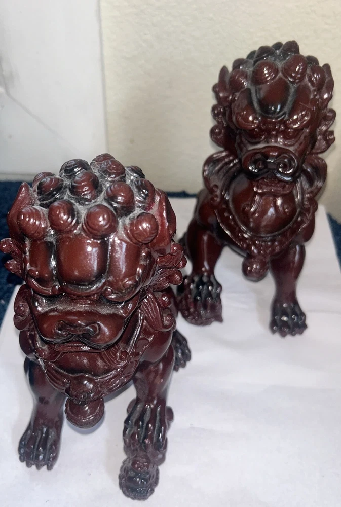 This pair of traditional Chinese Foo Dogs/Guardian Lions figurine is a beautiful addition to any collection. Made of high-quality cinnabar resin, these sculptures are intricately designed with a lion pattern and a dog subject. They measure 4 inches in length and are perfect for displaying on either side of a door or in a decorative niche. The brand of these figurines is Guardian and they belong to the Animals collection with a Chinese style. They are perfect for collectors who appreciate decorative collectibles and sculptures. These Foo Dogs are a great way to add a touch of elegance and sophistication to any space. 8’H x 6 to 7’ W. kk308