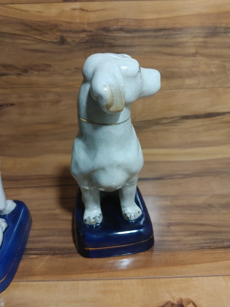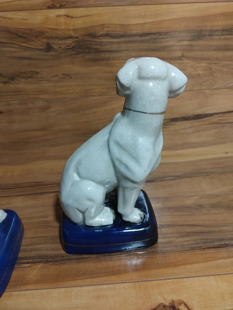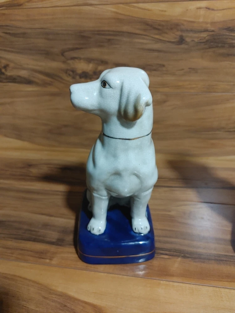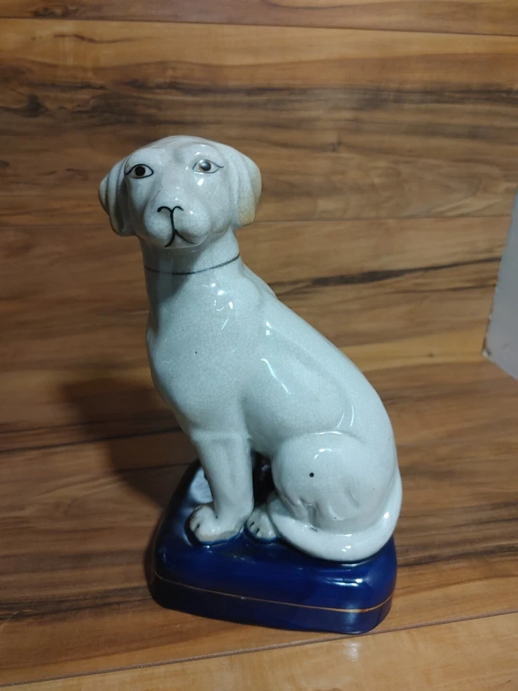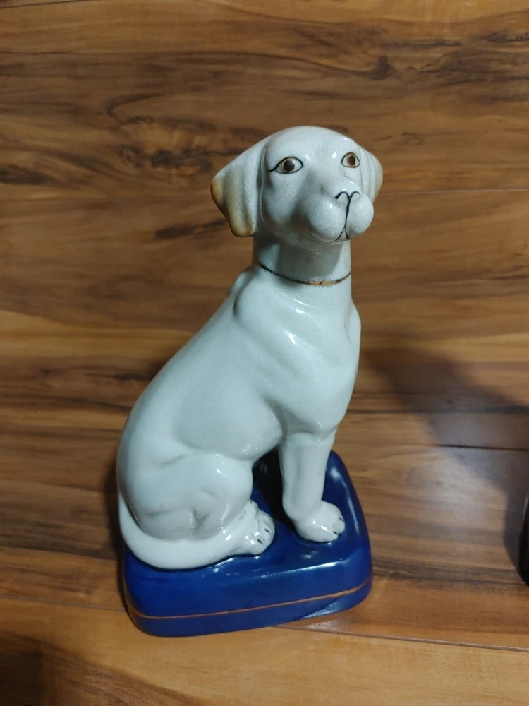 This pair of vintage Staffordshire Labrador Retriever dogs figurine is a charming addition to any collection. The intricate details of the porcelain and ceramic material make this piece a unique and special item. The white and blue color scheme adds a touch of elegance, and the glossy finish gives it a polished look. Measuring at 3 inches in length and 8 inches in height, this original figurine is a perfect decoration for any lover of dogs and flowers. The Victorian style and pottery production technique make it a valuable and timeless piece. This handmade figurine is a must-have for collectors and enthusiasts alike.