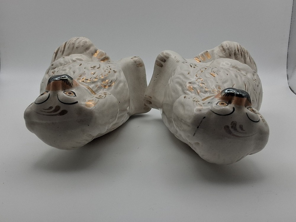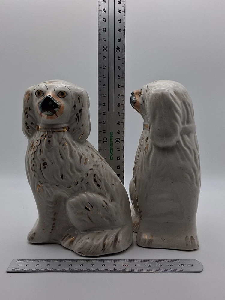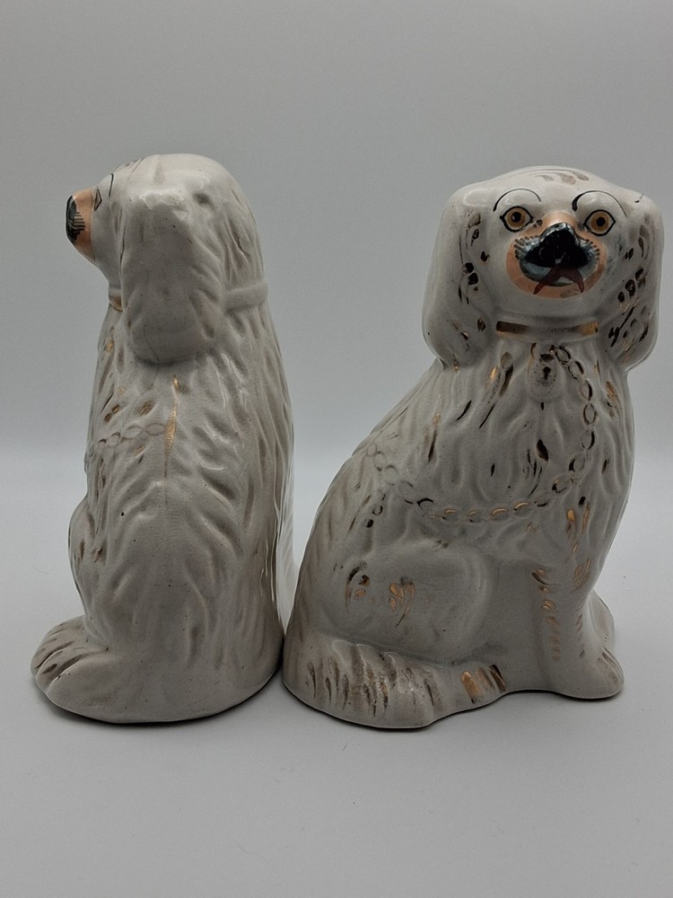 This pair of vintage Staffordshire style spaniel mantel dogs figurines are a charming addition to any Victorian-inspired décor. Made from ceramic with a glossy finish, these white figurines capture the essence of dogs with a classic and elegant style. Unmarked in terms of brand, these original pieces are a nostalgic nod to the art pottery production techniques of the United Kingdom, specifically in the Pot Dogs product line. Perfect for dog lovers and collectors alike, these figurines are a delightful touch of history and craftsmanship to any room.