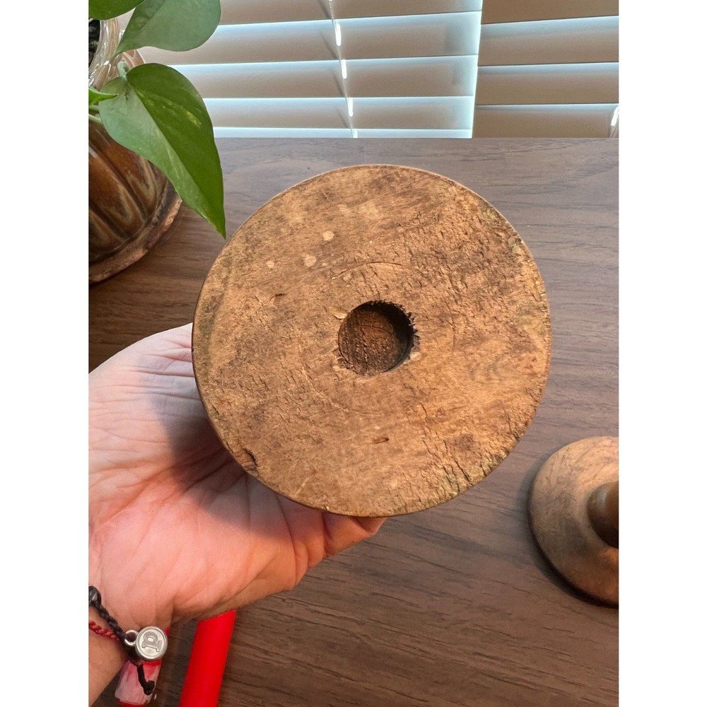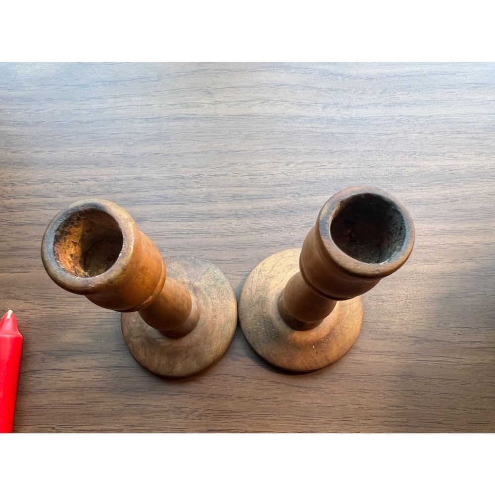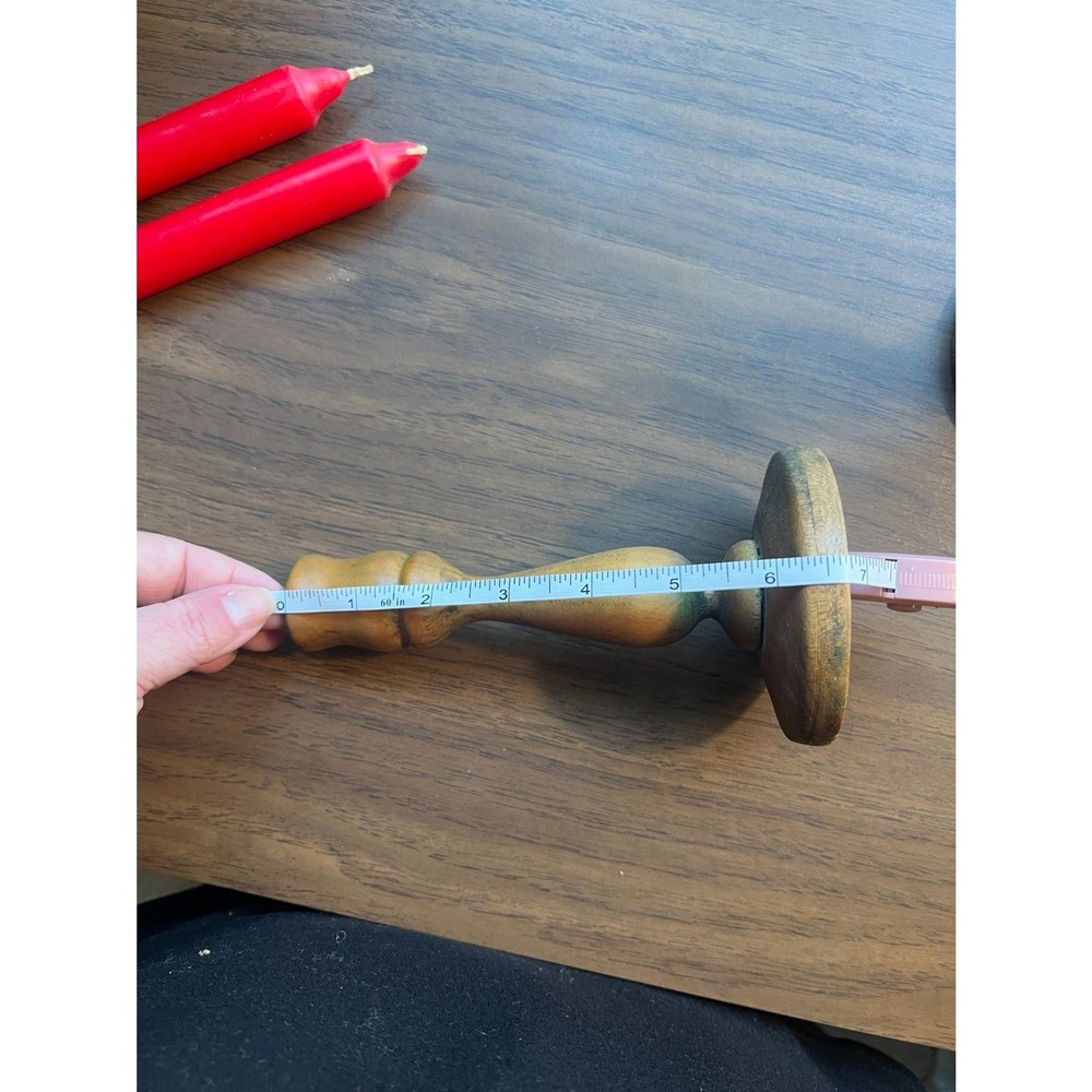 A classic pair of vintage turned wood candlestick holders, perfect for adding a warm, rustic touch to your home decor. This matching pair features a timeless, elegant design crafted from solid wood with a warm medium-brown finish. Their simple silhouette makes them incredibly versatile. These candlesticks are ideal for a dining table centerpiece, a mantel display, or as accents on a bookshelf. They complement a wide range of styles, including Farmhouse, Country, Colonial Revival, Rustic, and traditional decor. PLEASE NOTE: The red taper candles shown in the photos are for display purposes only and are NOT included with the sale of the candlestick holders. Details: Item: Matching Pair of Candlestick Holders Material: Solid Turned Wood Style: Farmhouse, Country, Colonial, Rustic Dimensions: Approximately 6 inches tall. Candles Included: No Condition: Excellent vintage condition. This pair shows some minor, lovely signs of age and wear, including light scuffs and a warm patina, which adds to their authentic character. There may be some minor wax residue in the candle cups from previous use. They are sturdy with no major cracks or damage. Please see all photos for a detailed look.