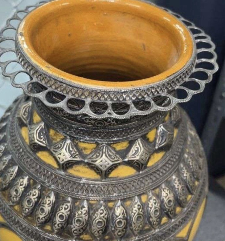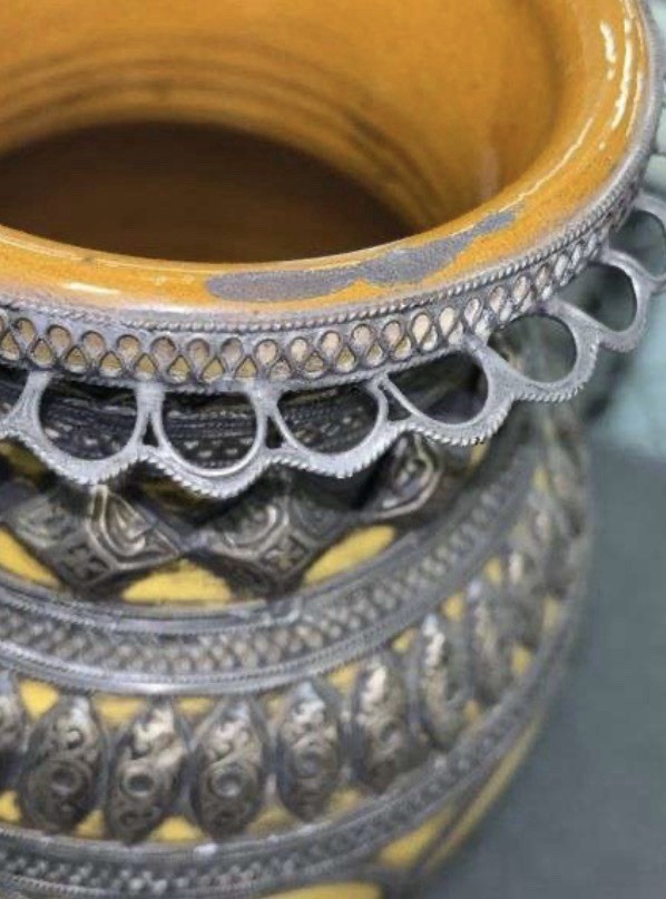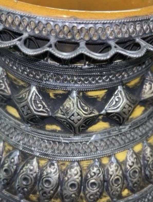 Pair of Yellow Silver Metal Ceramic Round Decorative Flower Vases Asian Style