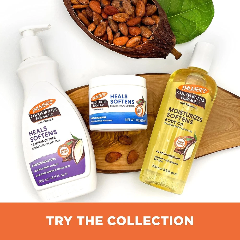 Palmer's Cocoa Butter Formula Fragrance Free Lotion 13.5 Fl Oz (Pack of 3) Product Details Product Dimensions : 5.88 x 3.42 x 9.05 inches; 2.53 Pounds Item model number : 4189NA Manufacturer : E.T. Browne Drug Company Inc. Country of Origin : USA Brand: Palmer's Item Volume: 13.5 Fluid Ounces Item dimensions L x W x H: 5.88 x 3.42 x 9.05 inches Age Range (Description): Adult Special Feature: Unscented Deep HYDRATING lotion: this 24-hour cocoa butter daily Moisturizing Body lotion is fragrance free & Provides deep, soothing hydration for sensitive skin Special formula: this lotion is made with cocoa butter to naturally moisturize & Vitamin E to help improve the appearance of scars, stretch marks & Skin. Finest Ingredients: we strive to use only the finest natural, raw INGREDIENTS to bring you soft, hydrated & beautiful hair & Skin. We support sustainable production of Shea & Cocoa butter & Coconut Oil worldwide. Choose what's real: our beauty products & hair & Skin treatments feature real high-quality, plant-based ingredients in formulas that really work to hydrate & soften, from lip balm to bar Soap to body butter. Palmer's: our cocoa butter, coconut oil, Shea butter, olive oil, & vitamin E product lines include creams, balms, lotions, oils & soaps for hand & Body, face, lip, sun care, hair care & pregnancy & Stretch mark care. Palmer's Cocoa Butter Formula fragrance free body Lotion, made with pure cocoa butter, enriched with Vitamin E, in a soothing fragrance free base, heals and softens rough, dry skin, smoothes marks and tones skin. it is an excellent all-over-the-body moisturizer and after tanning butter.