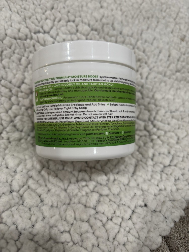 Period After Opening (PAO): 24M Formulation: Cream Size: Standard Size Country/Region of Manufacture: United States Type: Moisturizer Scent: Coconut Volume: 150 gram Active Ingredients: Natural Oils, Vitamin E Department: Adult, Men, Women Hair Type: Curly Hair Features: Cruelty-Free/No Animal Testing Ingredients: Coconut Oil, Natural Oils, Vitamin E, Tahitian monoi oil Expiration Date: NA Styling Effect: Moisturizing, Moisture Boost, Gro Treatment Brand: Palmer's Product Line: Palmer's
