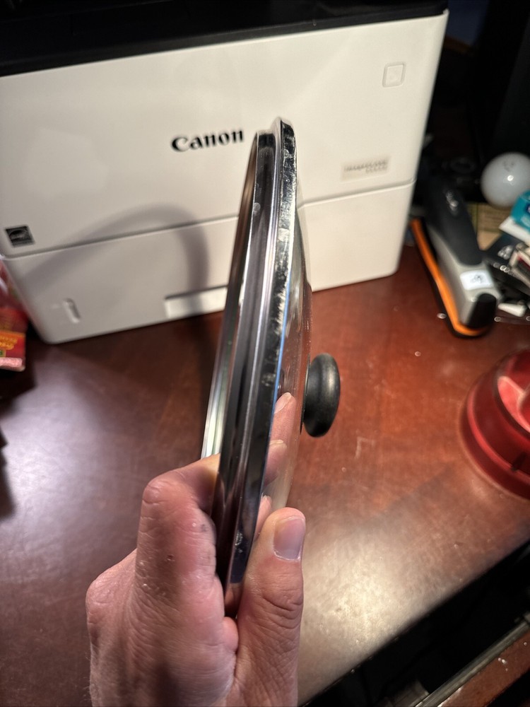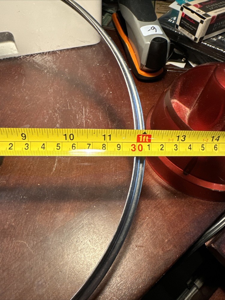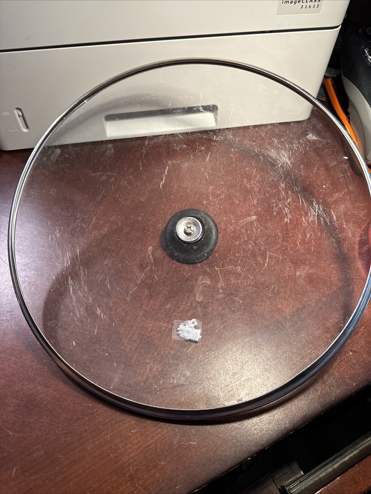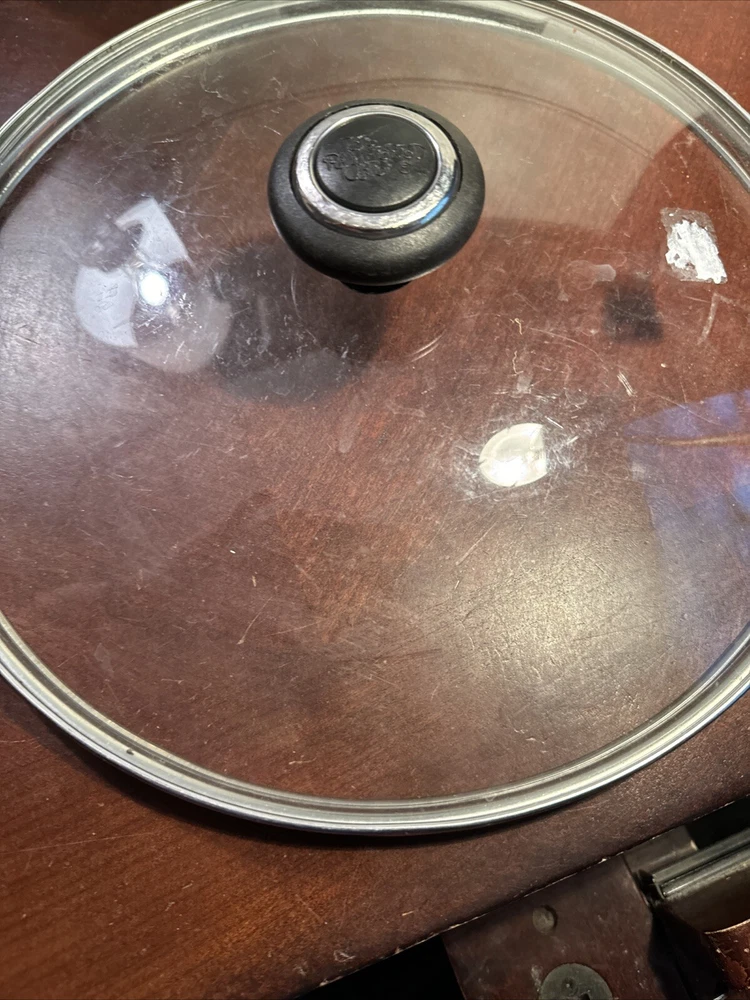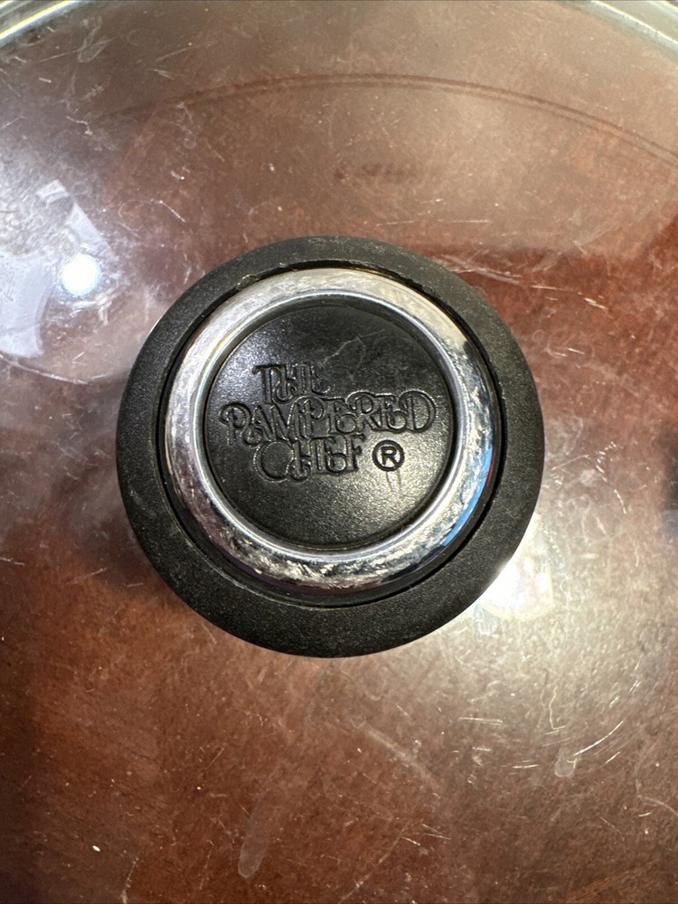 Upgrade your kitchen cookware with this Pampered Chef 12" Tempered Glass Skillet Pot Lid. Crafted from durable stainless steel, this lid is a perfect replacement for your old lid. It is compatible with induction, electric, and gas stoves and has a clear glass material that allows you to easily view the contents of your skillet. The round shape of the lid and the 12-inch diameter make it a perfect fit for your skillet. It also features a knob for easy handling. This lid is a great addition to your cookware collection and will make your cooking experience more enjoyable. Has some scratches but no breaks.