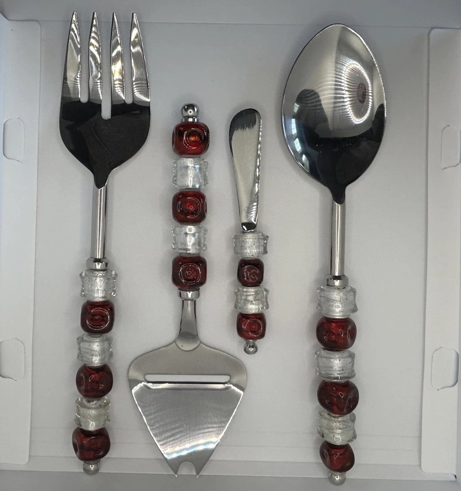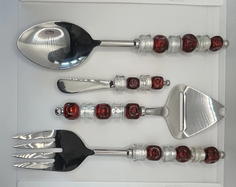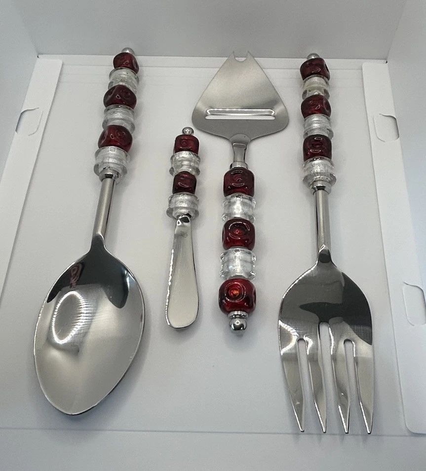 Elevate your holiday table settings with the Pampered Chef Beaded Stainless Steel Serving Utensils Set. This charming set of four includes spoon, and fork, pie server and cheese knife each adorned with red and silver beads that exude a festive and elegant charm. Crafted from durable stainless steel, these serving pieces are perfect for your Christmas celebrations and will complement any holiday-themed decor with their vibrant color scheme. Designed to both delight and function, these utensils are a great addition to your serving collection. The spoon and fork are perfect for serving up your favorite holiday dishes, while the cheese spreader is great for appetizers . Whether you're hosting a formal dinner or enjoying a casual meal with family, this set brings a touch of holiday cheer to every table setting.