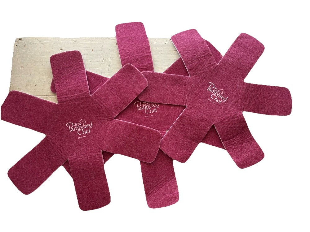 Keep your Pampered Chef cookware safe and sound with this set of 3 kitchen protectors. Made from durable cloth and fabric materials and featuring a vibrant red color, these protectors are both functional and stylish. 3 protectors 2 measures 16 inches and 1 is 19 in diameter. They designed to fit most standard cookware pots and pans. Crafted in China, these protectors are perfect for keeping your kitchen organized and tidy while also preventing damage to your cookware. Whether you're a professional chef or a home cook, these Pampered Chef cookware protectors are an essential kitchen tool that will save you time and money in the long run. Get yours today and keep your cookware looking like new! K10484