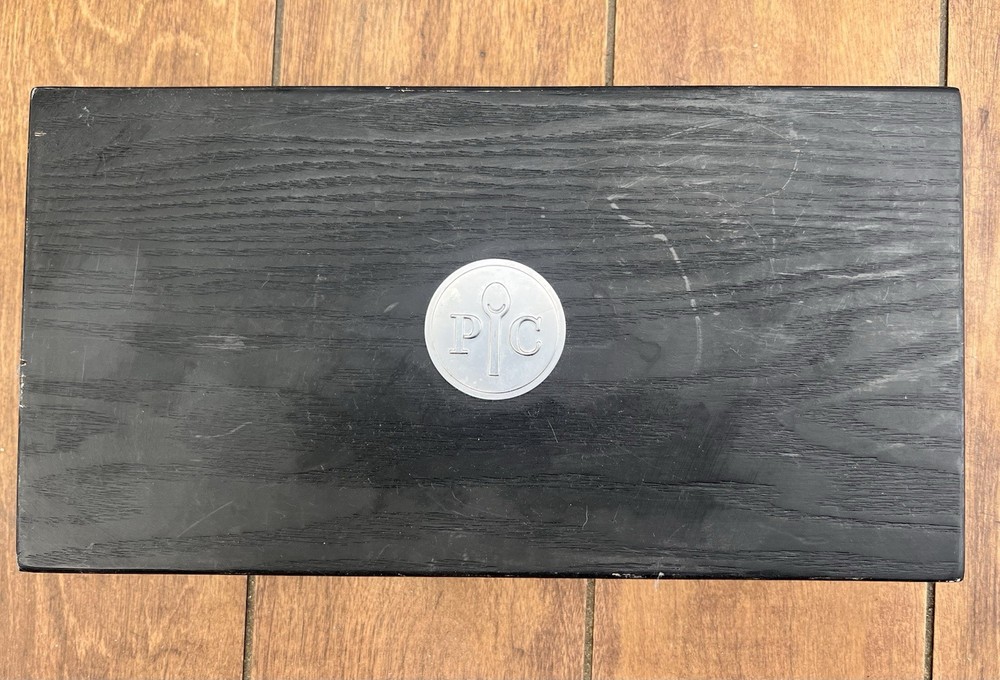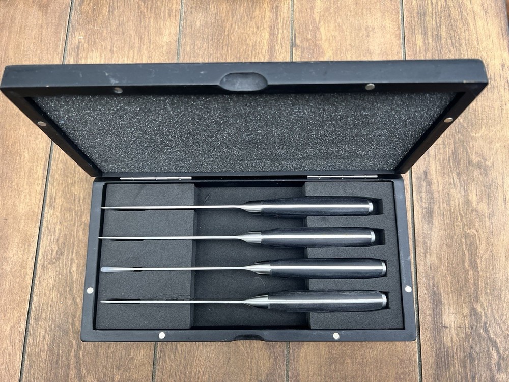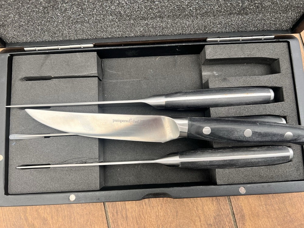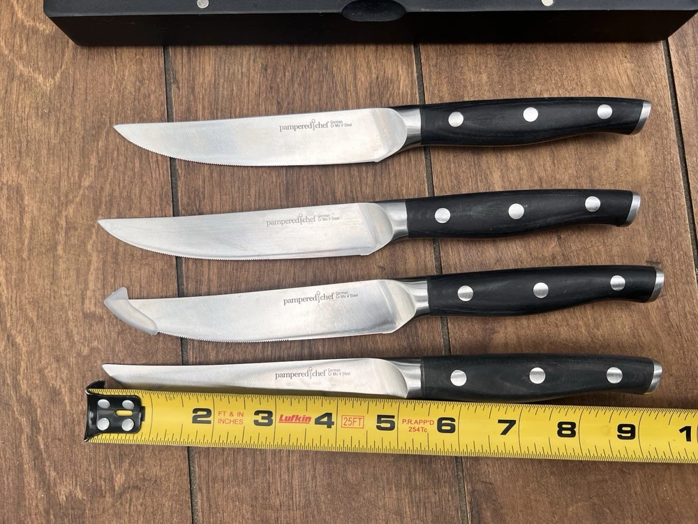 The Pampered Chef Steak Knife Set includes four black knives made of stainless steel and plastic materials. These knives are designed for easy cleaning this set is perfect for those looking to upgrade their kitchen tools with high-quality, durable knives ideal for cutting through steaks with precision and ease. Only two of these knives have ever been used just a handful of times Excellent sharp like new condition Box is also in excellent condition
